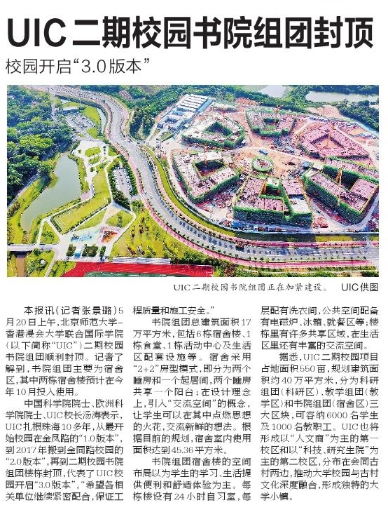 本报讯(记者张景璐)5月20日上午,北京师范大学-香港浸会大学联合国际学院(以下简称“UIC”)二期校园书院组团顺利封顶。记者了解到,书院组团主要为宿舍区,其中两栋宿舍楼预计在今年10月投入使用。