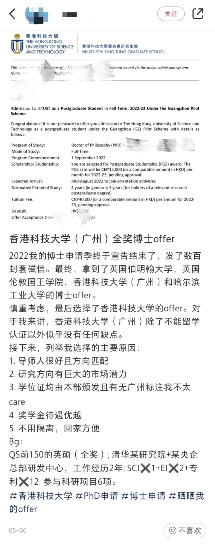 网友晒香港科技大学(广州)Offer。/小红书截图