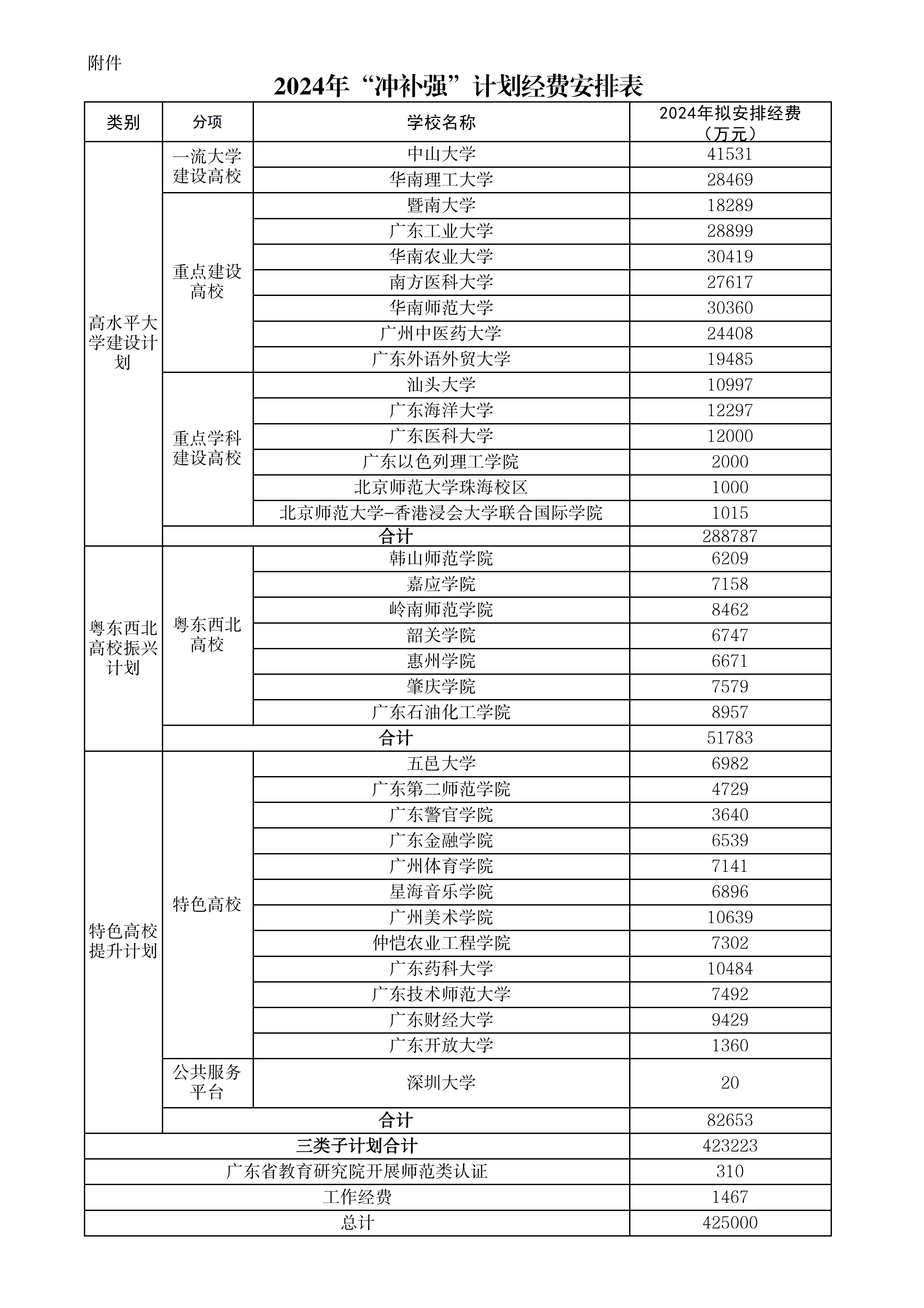 在2024年的“冲补强”方案中,此项资金除1467万工作经费外,此次资金安排分为三大类别:“高水平大学建设计划”“粤东粤西粤北高校振兴计划”“特色高校提升计划”。相比2023年,2024年新增了广东省教育研究院开展师范类认证的310万元,广州航海学院暂不在此次资金安排之列。