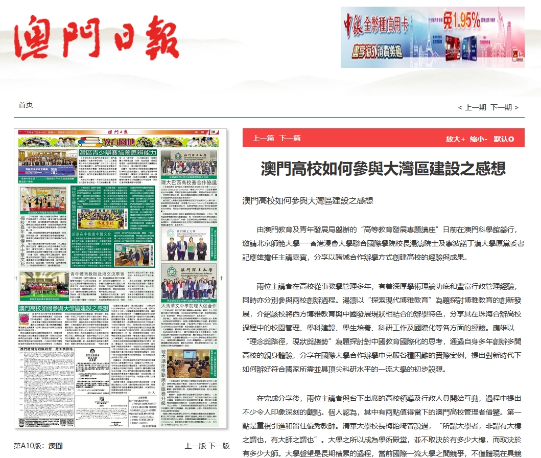 由澳門教育及青年發展局舉辦的“高等教育發展專題講座”日前在澳門科學館舉行,邀請北京師範大學──香港浸會大學聯合國際學院校長湯濤院士及寧波諾丁漢大學原黨委書記應雄擔任主講嘉賓,分享以跨域合作辦學方式創建高校的經驗與成果。