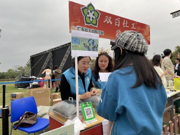 此外,游园会还融入了许多志愿服务的元素,由会同社区党委联合双百社工点在活动现场设置了宣传摊位,通过问答游戏宣传普及双百知识,吸引众多学生及游客参加。双百工程民生政策的宣传让大学生们了解了社工的服务对象和内容,学习到志愿服务的精神,也展示了社区与学校共同传播的正能量。