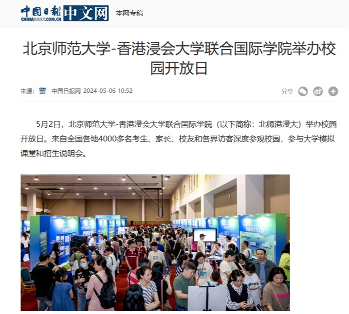 5月2日,北京师范大学-香港浸会大学联合国际学院(以下简称:北师港浸大)举办校园开放日。来自全国各地4000多名考生、家长、校友和各界访客深度参观校园,参与大学模拟课堂和招生说明会。