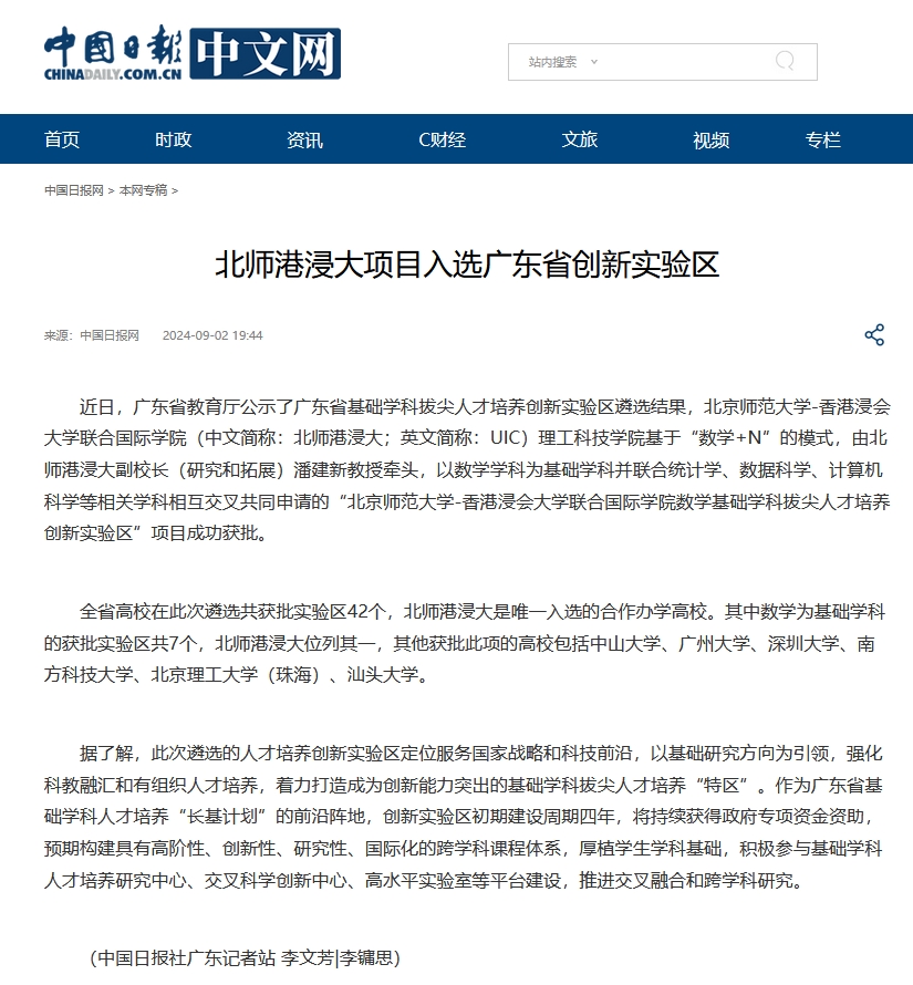 全省高校在此次遴选共获批实验区42个,北师港浸大是唯一入选的合作办学高校。其中数学为基础学科的获批实验区共7个,北师港浸大位列其一,其他获批此项的高校包括中山大学、广州大学、深圳大学、南方科技大学、北京理工大学(珠海)、汕头大学。