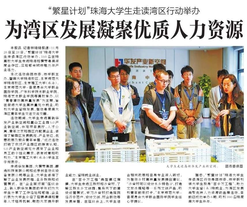 本报讯 记者林琦琦报道:11月26日至28日,“繁星计划”珠海大学生走读湾区行动举办,150名在珠高校大学生走进珠海和横琴粤澳深度合作区,实地感受城市魅力与产业活力。