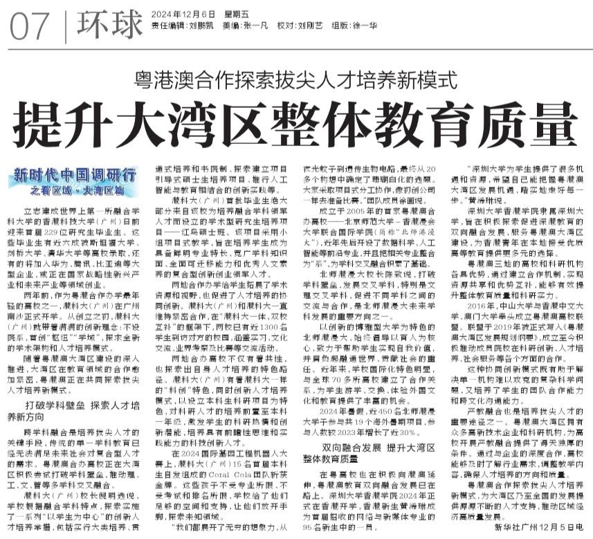 随着粤港澳大湾区建设的深入推进,大湾区在教育领域的合作愈加紧密,粤港澳正在共同探索拔尖人才培养新模式。