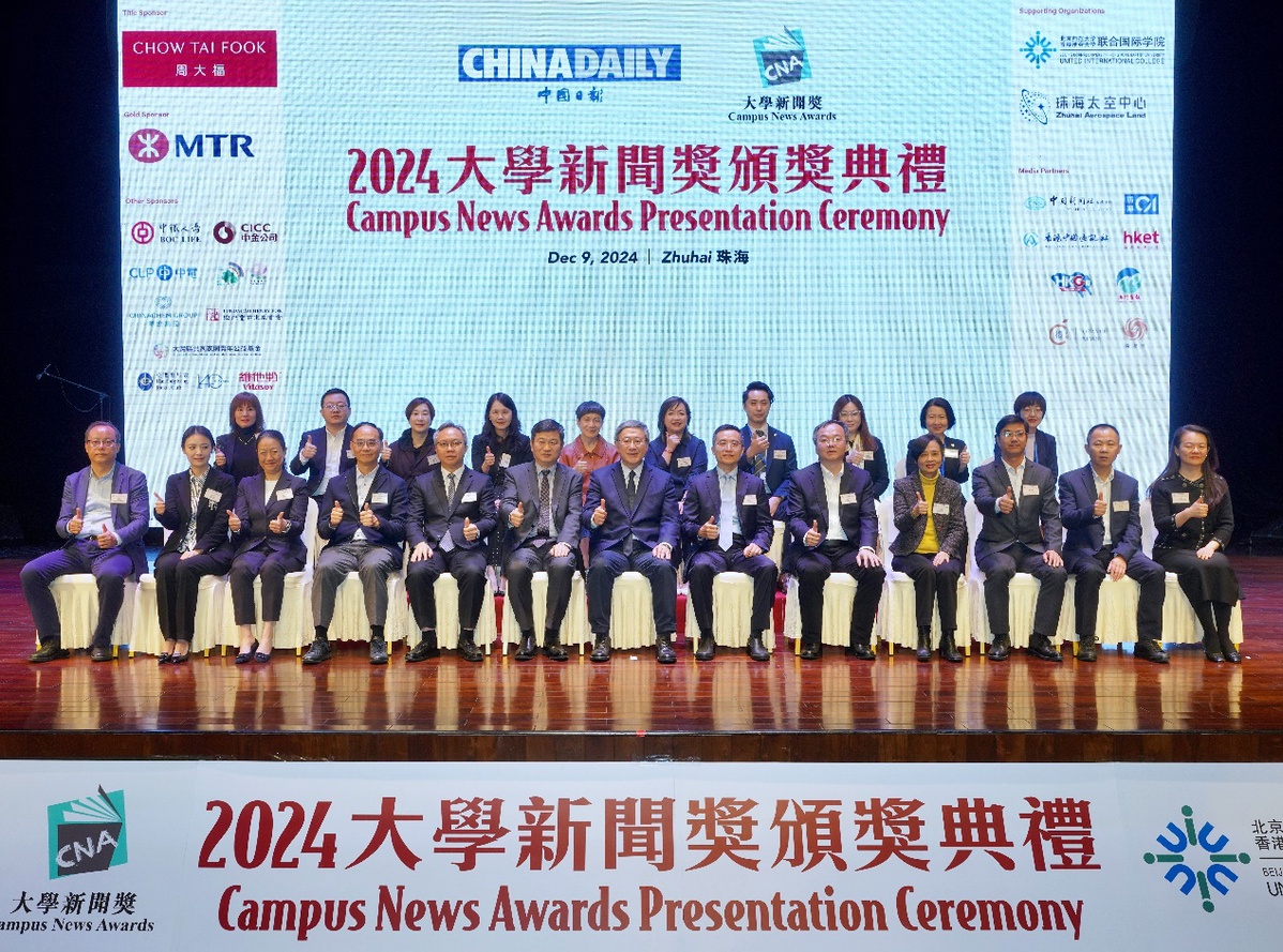 由中国日报主办的2024大学新闻奖颁奖典礼于12月9日在北京师范大学-香港浸会大学联合国际学院(UIC)举行。香港特别行政区政务司副司长卓永兴、北京师范大学-香港浸会大学联合国际学院校长陈致、周大福珠宝集团董事总经理黄绍基现场致辞,中国日报社副总编辑兼香港版总编辑周立致欢迎辞,香港迪士尼乐园传讯及公共事务副总裁黎珮珊在中场发表演讲。今年,大学新闻奖组委会还于颁奖典礼前后组织师生参访团,到周大福顺德匠心智造中心及珠海太空中心参访交流,深入了解大湾区的商业与科技发展文化。