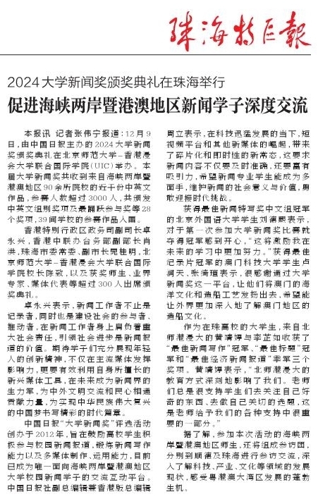 2024.12.11[珠海特区报]--2024大学新闻奖颁奖典礼在珠海举行 促进海峡两岸暨港澳地区新闻学子深度交流