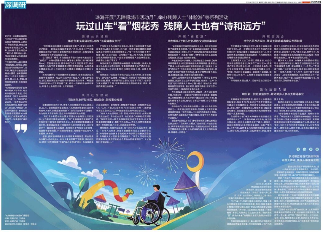 “无障碍城市活动月”由珠海市残疾人联合会、南方都市报社联合发起,活动时间从12月开始持续至2025年1月。“活动月”启动以来,一批专题活动在珠海陆续举行,包括“深调研”、交流会、“体验游”、培训等丰富内容,推动社会各界重视无障碍城市建设,助力“有爱无碍”成为珠海又一张亮眼的“城市名片”。