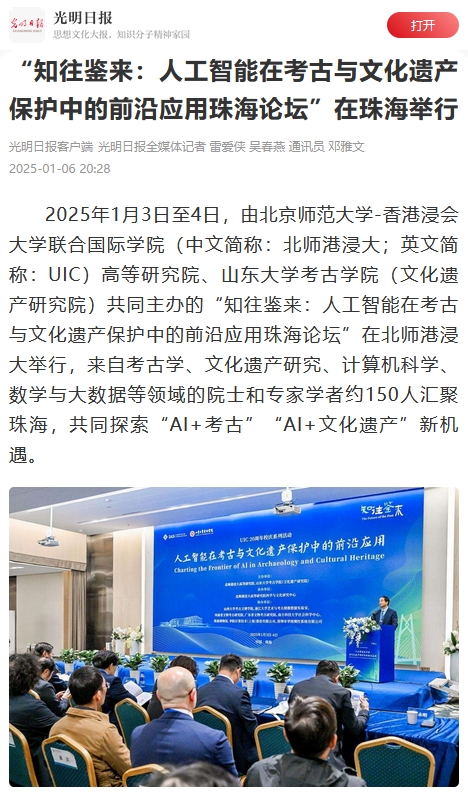 2025年1月3日至4日,由北京师范大学-香港浸会大学联合国际学院(中文简称:北师港浸大;英文简称:UIC)高等研究院、山东大学考古学院(文化遗产研究院)共同主办的“知往鉴来:人工智能在考古与文化遗产保护中的前沿应用珠海论坛”在北师港浸大举行,来自考古学、文化遗产研究、计算机科学、数学与大数据等领域的院士和专家学者约150人汇聚珠海,共同探索“AI+考古”“AI+文化遗产”新机遇。