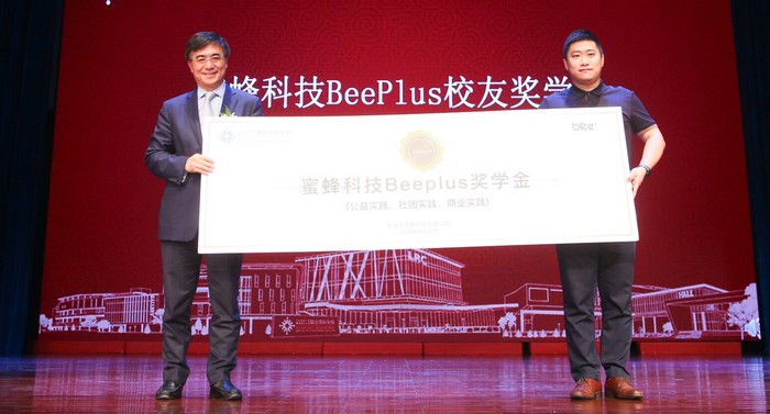 汤校长接受校友企业BeePlus代表2014届公共与广告专业奥日其朗捐赠校友奖学金支票