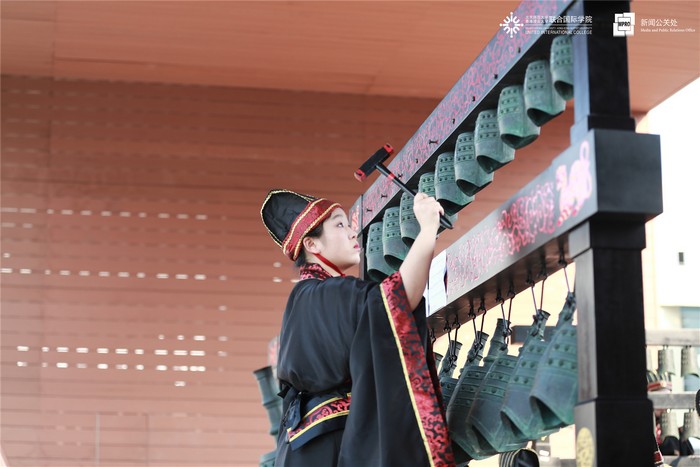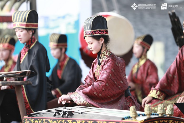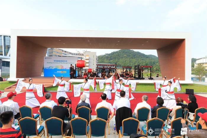 在“中和”雕塑揭幕仪式上,UIC雅乐团也首次正式亮相,演奏了《望月婆罗门》《双鼓楚商》《木瓜》等乐曲,给大家带来不同凡响的文化体验。据全人教育办公室主任郭海鹏博士介绍,这是岭南地区首个高校雅乐团。雅乐泛指古代宫廷音乐,于西周周公时制礼作乐,通过礼乐制度让“乐”做到和谐精神、陶冶情操。UIC雅乐团于2018年3月成立,现有成员有20余人,所用部分乐器是以广州南越王墓出土的青铜乐器按1:1的比例复制而成的。