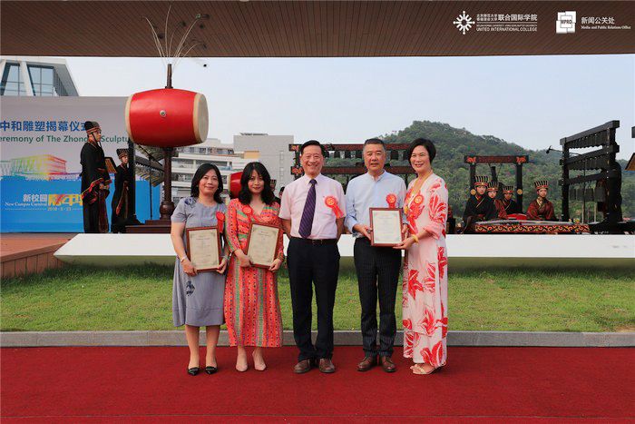 伫立在中和广场的中和雕塑寓意着中西合璧、兼容并包,由香港著名雕塑家文楼先生设计。他也来到现场,与师生们一起为雕塑揭幕。