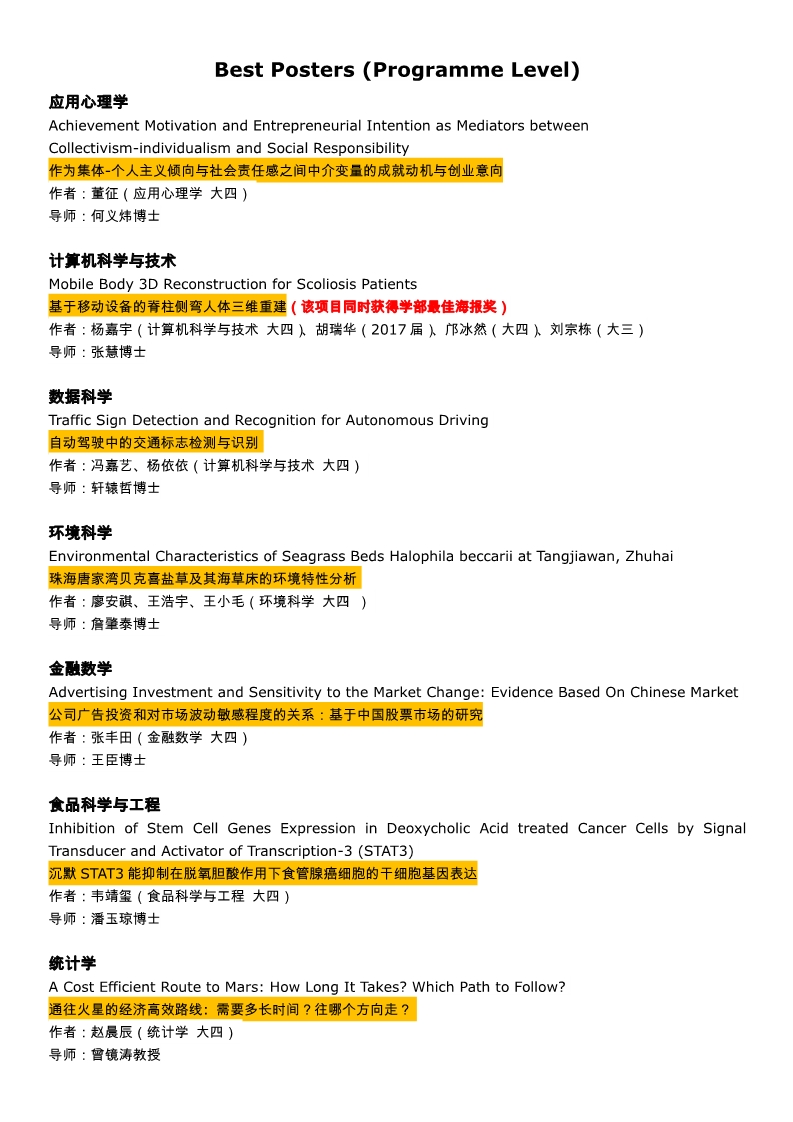 计算机科学与技术专业的杨嘉宇(大四)、胡瑞华(2017届)、邝冰然(大四)、刘宗栋(大三)的研究项目“基于移动设备的脊柱侧弯人体三维重建”并获专业最佳海报奖与学部最佳海报奖