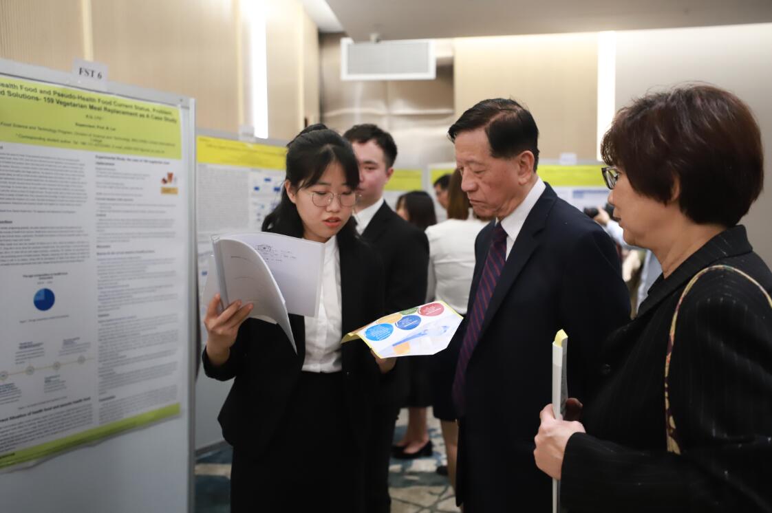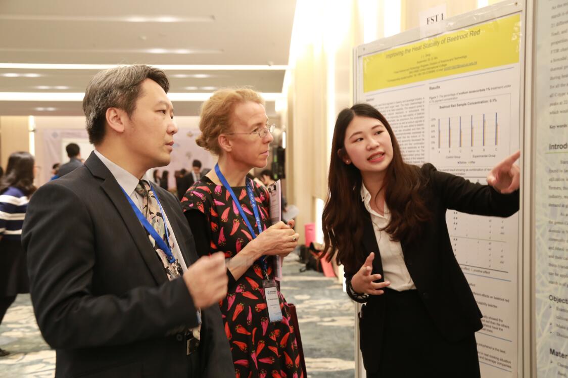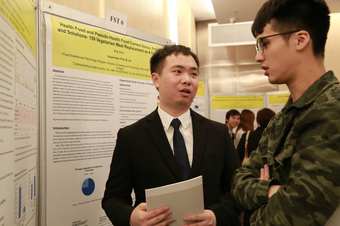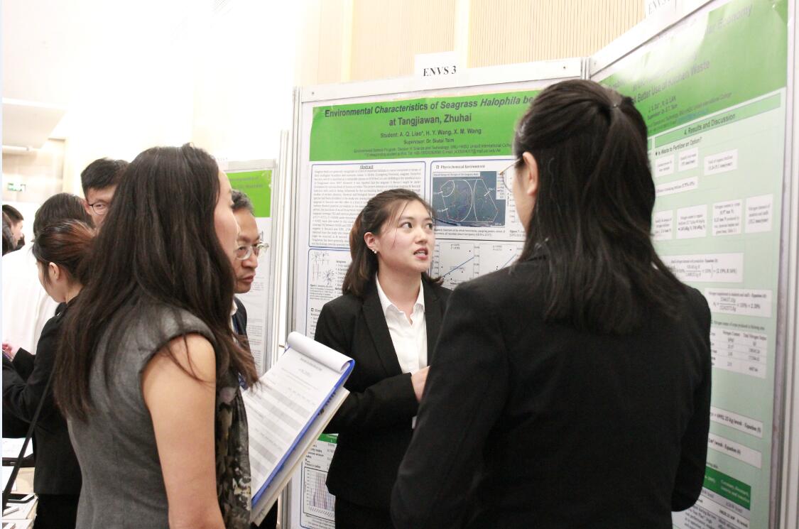 在海报展上,学生须用英文向参观者讲解他们的研究成果。校长吴清辉教授表示,海报展提供了学生与来自不同学科的同辈、优秀的研究机构和企业代表交流的平台,通过设法回答参观者新奇的问题,学会如何生动地、有逻辑和有意义地去展示研究成果。