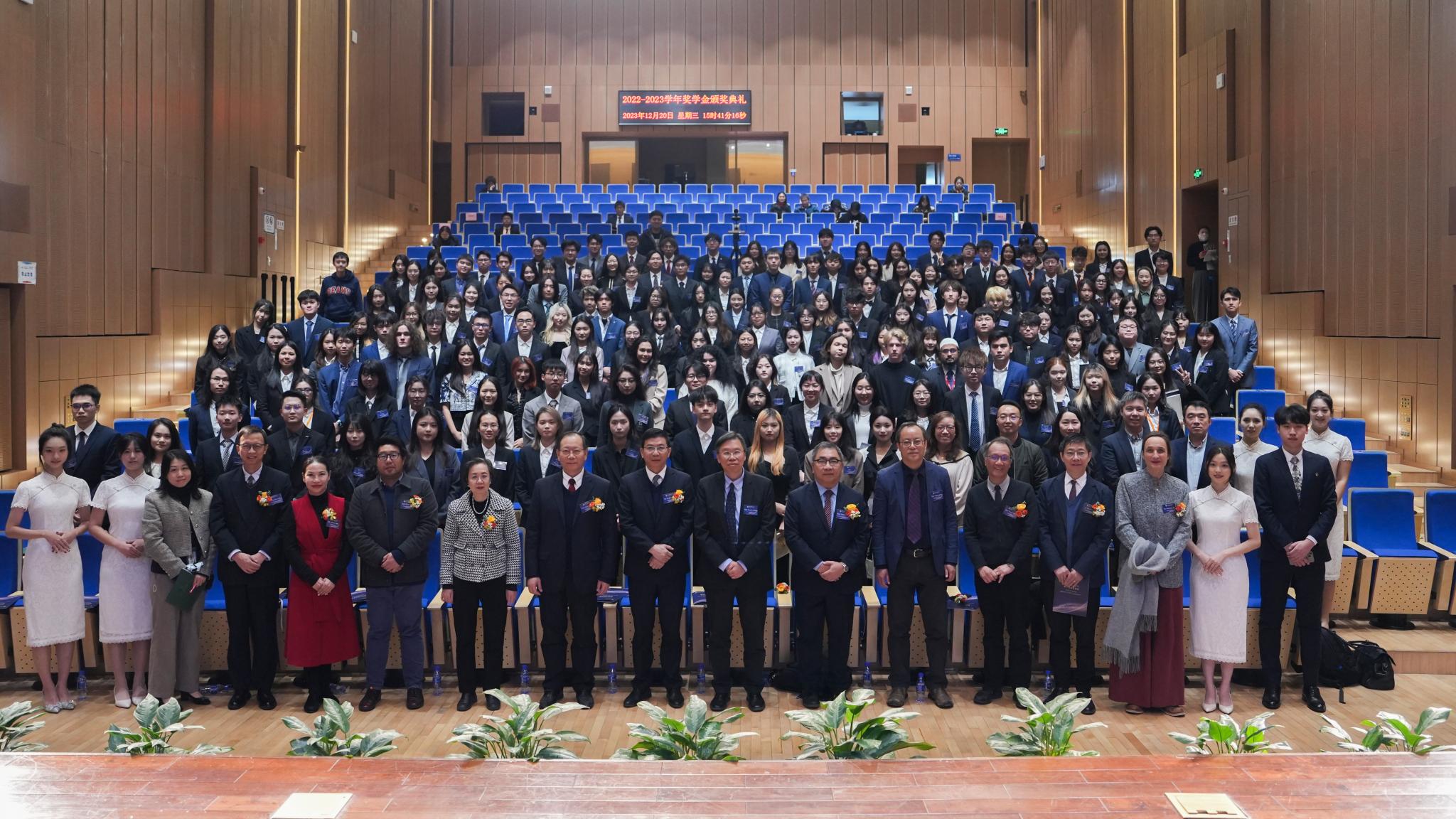 UIC senior management including Provost Prof Patrick Chau, Party Secretary of the College Party Committee, Vice President (Administration) Prof Mao Yaqing, Associate Vice President (Student Development), Acting Dean of School of General Education Prof Stella Cho, Associate Vice President (Internationalisation), Dean of Faculty of Science and Technology Prof Pan Jianxin, Academic Registrar Prof Li Jianhui with Director of Fung Sun Kwan Chinese Arts Foundation Prof Lee Hung-kai and CEO of Guangdong Medical Valley Mr Xie Jiasheng presented the scholarships to the awarded students.