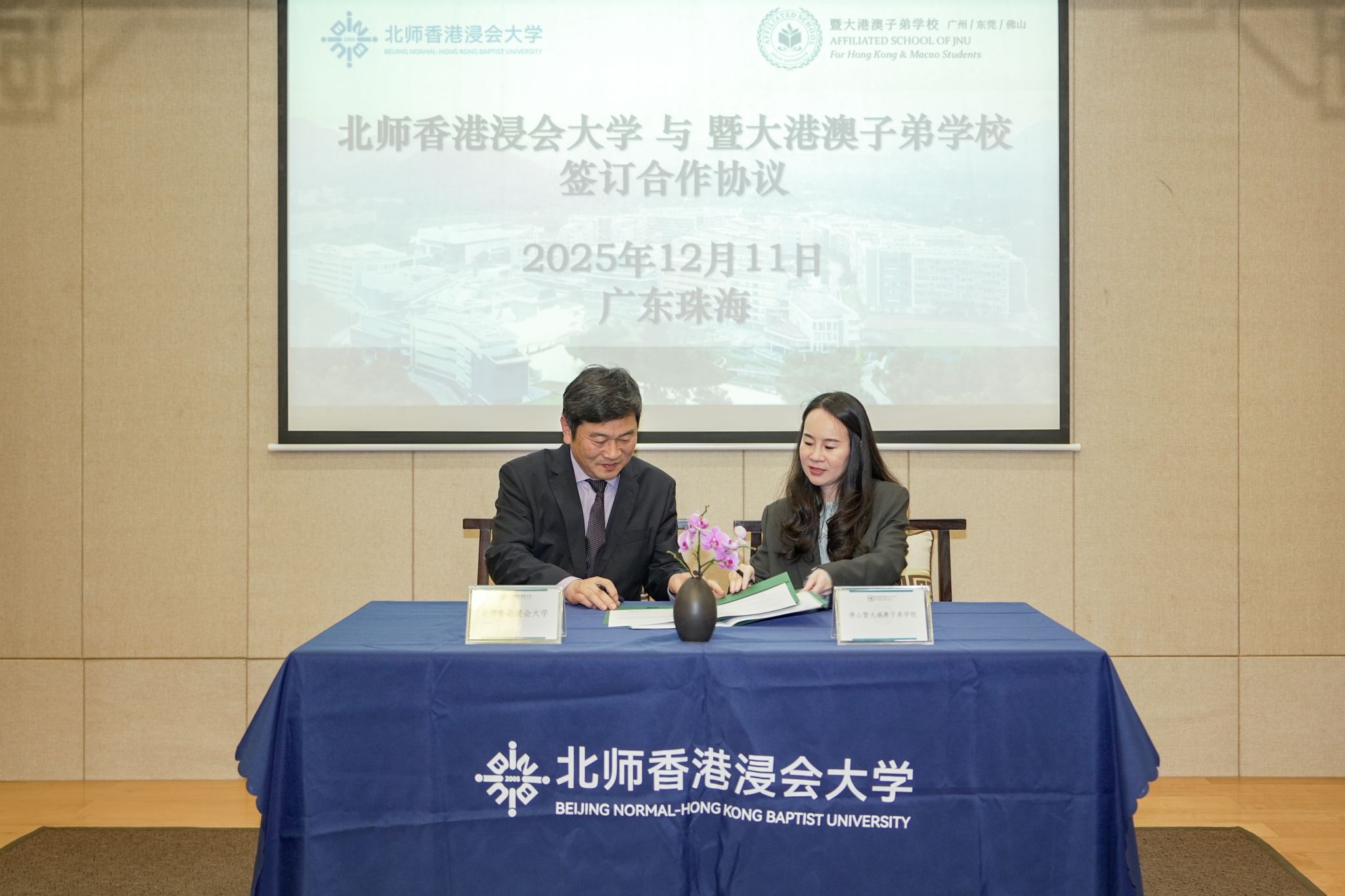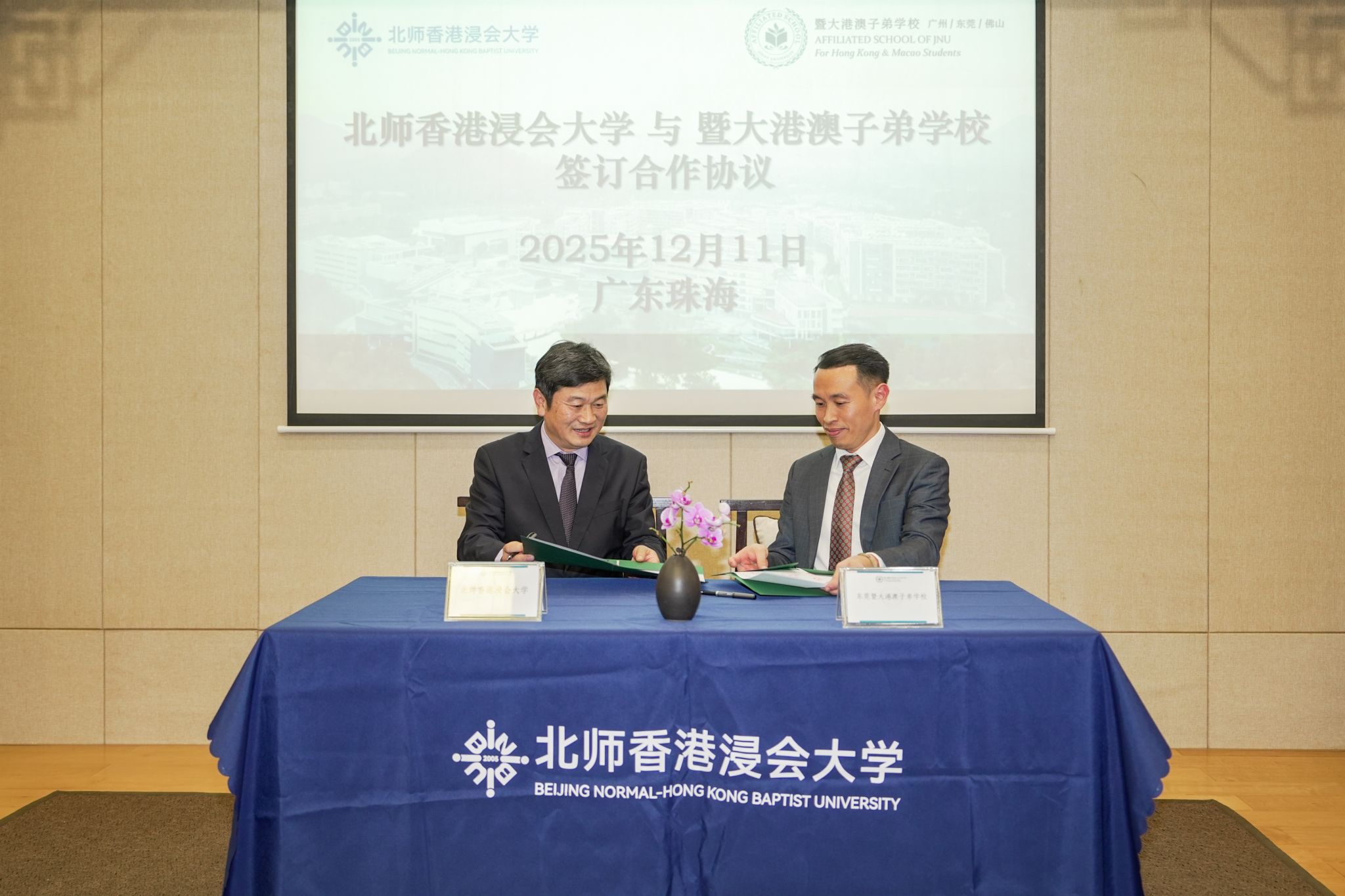 On 11 December 2025, Beijing Normal–Hong Kong Baptist University (BNBU) signed a Memorandum of Understanding with the Affiliated School of JNU for Hong Kong and Macao Students (ASJ), marking the formal launch of a new partnership aimed at talent development, internship opportunities, and academic exchange. The collaboration is expected to further promote resource sharing and coordinated talent cultivation within the Guangdong–Hong Kong–Macao Greater Bay Area.