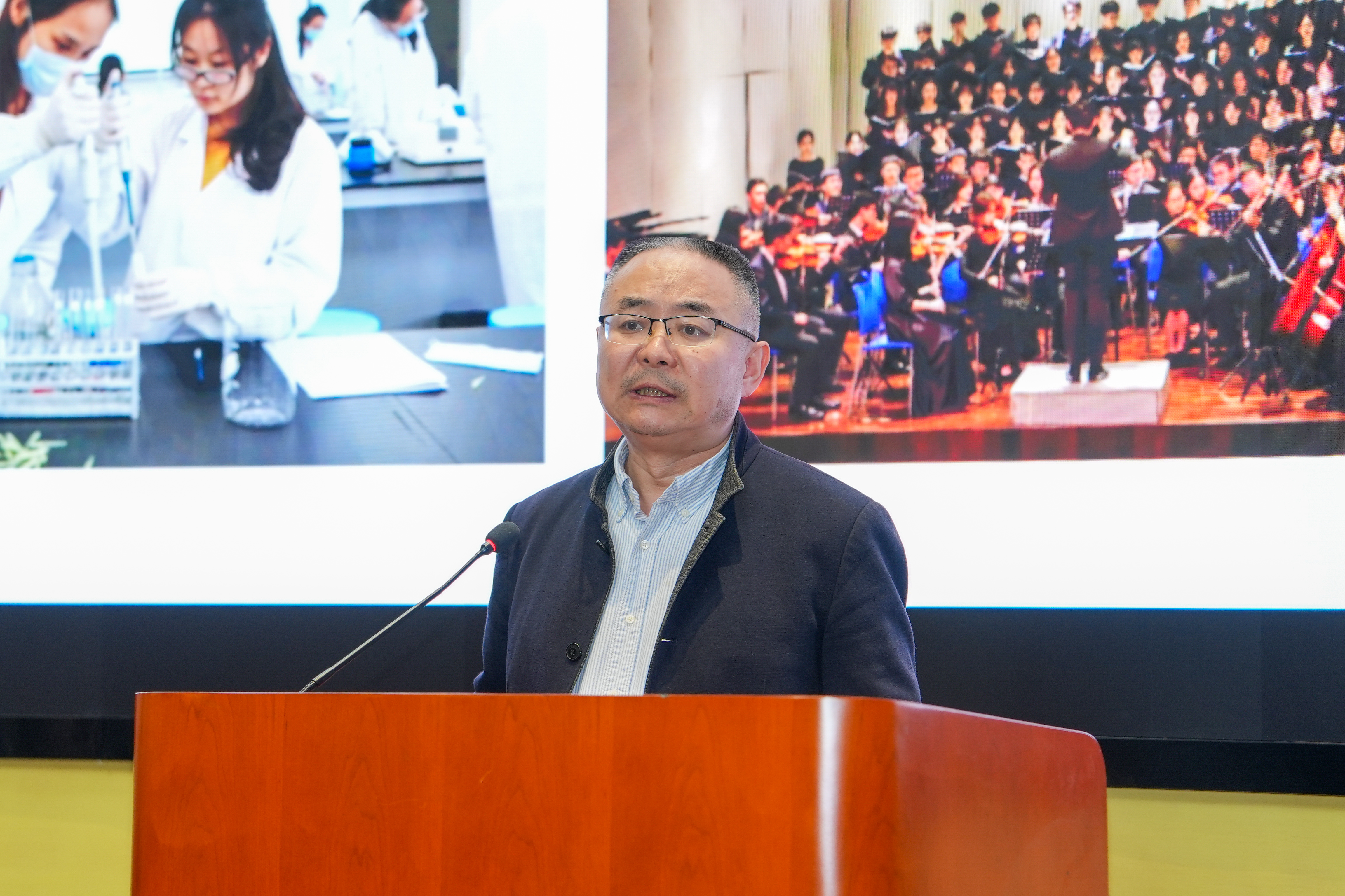 Dean of the School of General Education at BNBU Prof Guo Haipeng introduces BNBU's 2026 admission plan in Hong Kong to the guests