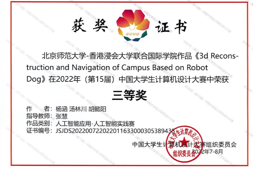 Three UIC students of the Computer Science and Technology Programme: Yang Han, Tang Linchuan and Hu Yiyang, designed a work named “3D Reconstruction and Navigation of Campus Based on Robot Dog”, winning the third prize at the College Student Computer Design Competition.