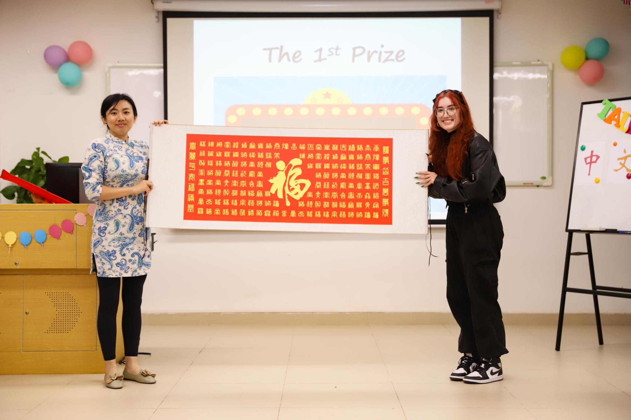 CLCC teacher Ms Candy Cai presents the Lucky Draw 1st Place Prize--a scroll of One Hundred Blessings (百福图) to student recipient