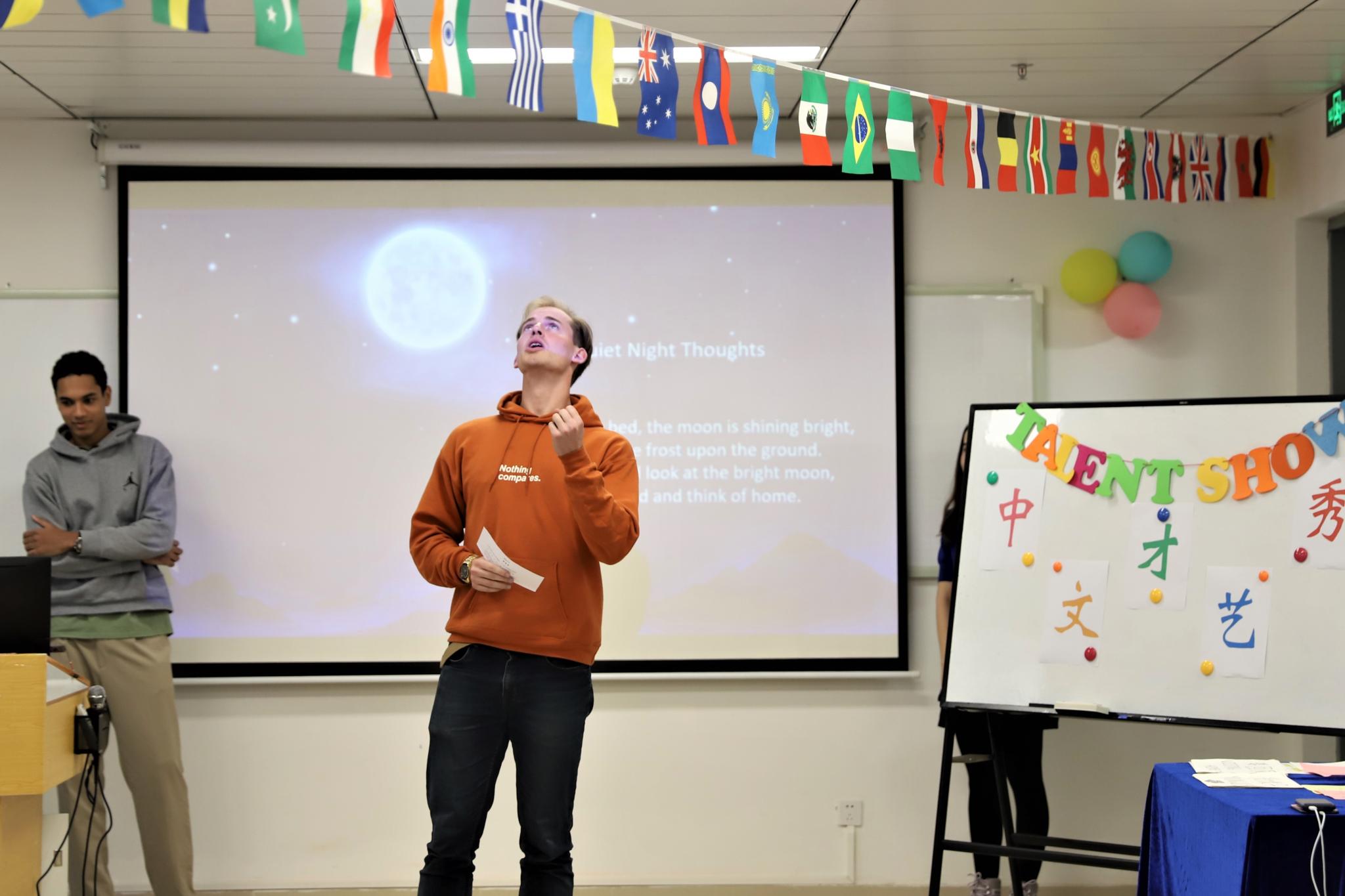 Senior American exchange-in student Jonas Doerr gave a particularly soulful performance, leaving the audience torn between laughter and tears. He later explained, "I tried to recite this classic poem about homesickness with genuine sadness. But it took a lot of acting, because being surrounded by my friends here at UIC, it already feels like I'm home."