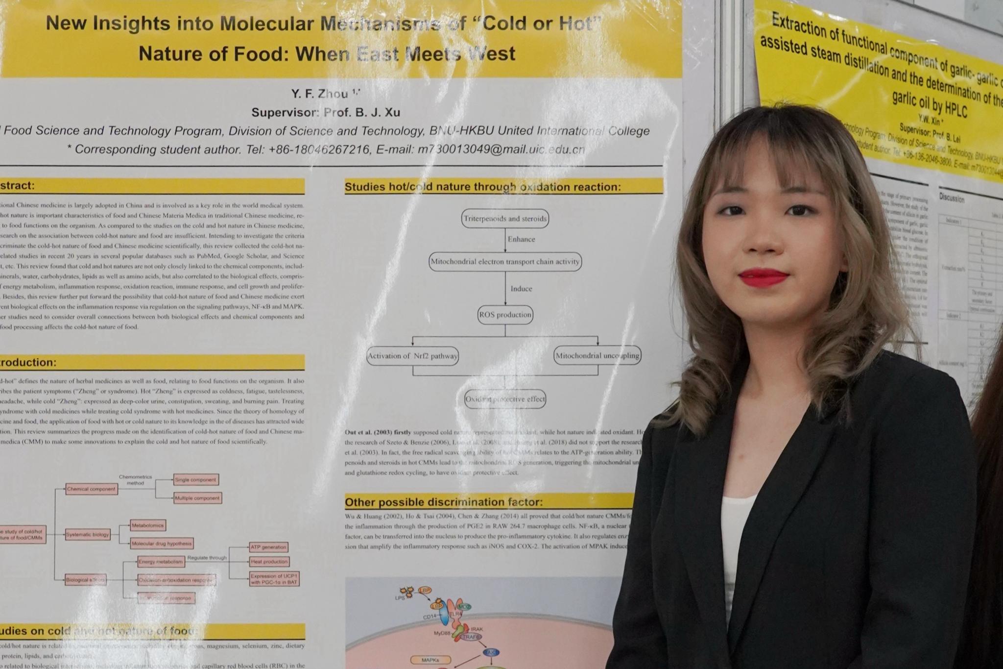 Zhou developed a research interest in food and disease during her undergraduate study. Guided and encouraged by the Head of UIC's Department of Life Sciences, Prof Xu Baojun, she began to conduct review studies on the functional foods such as matsutake and saponins on inflammation, cancer, obesity and diabetes, and accumulated a great deal of knowledge about phytochemistry, biotechnology, and the mechanisms and treatments of chronic diseases. Her thesis, New insights into molecular mechanisms of "Cold or Hot" nature of food: When East meets West, was published in the internationally renowned journal Food Research International. In the second semester of her final year, she completed another review paper on the signalling pathways of dietary saponins in anti-cancer molecules, and it was published in the international authoritative journal, Critical Reviews in Food Science and Nutrition.