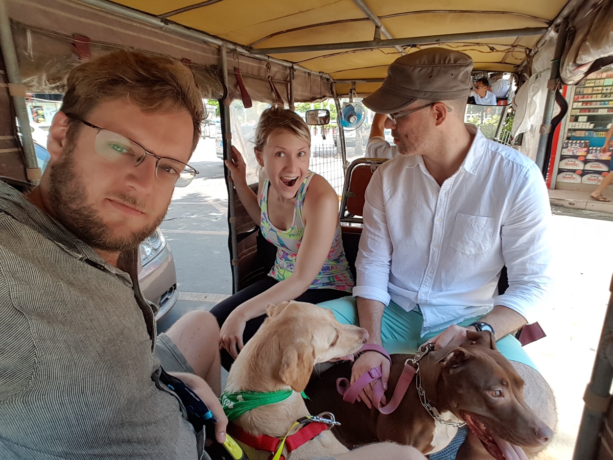 Jesse, friends, and dogs in a tuk-tuk in Tangjia