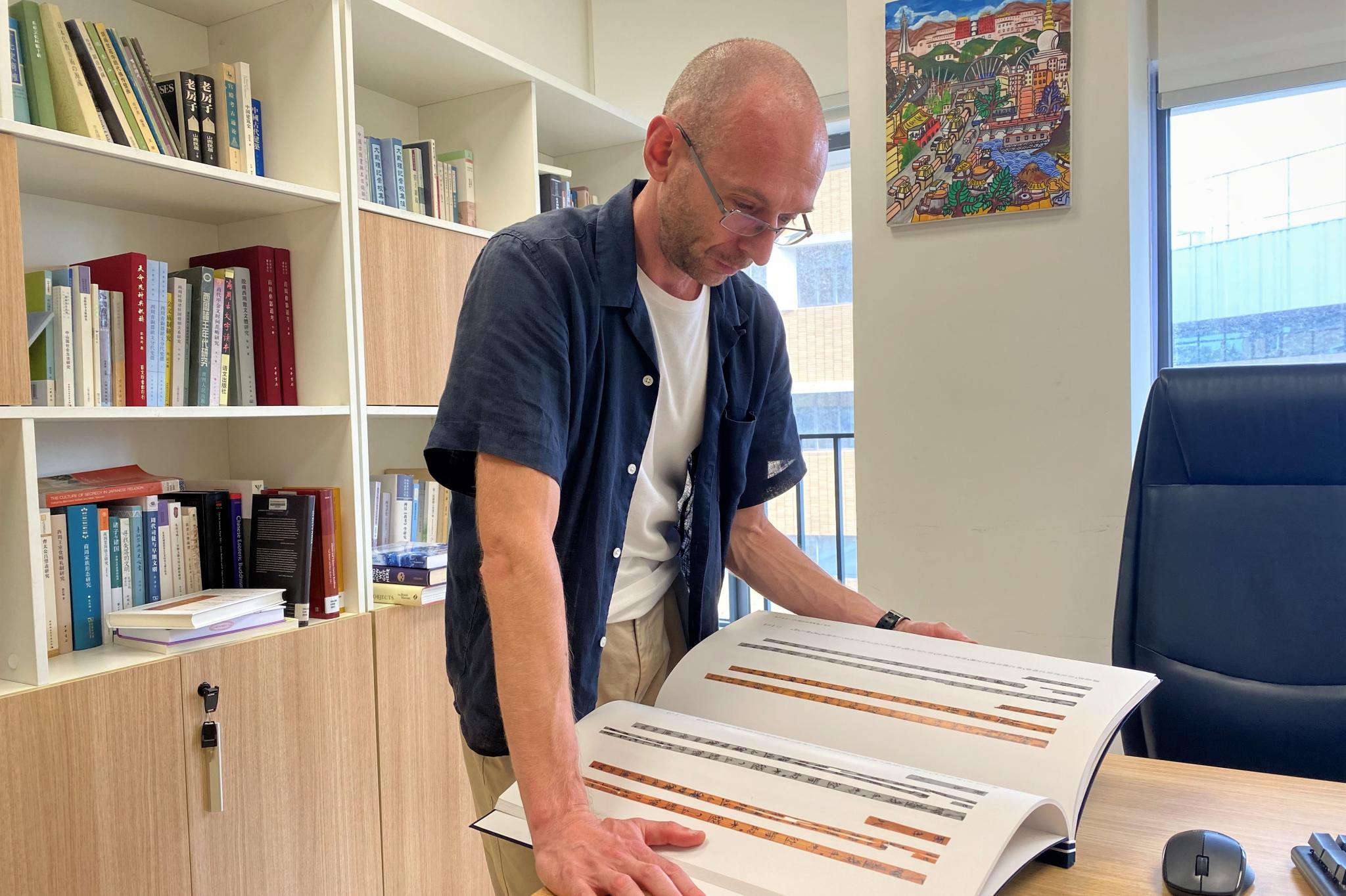 Dr Grebnev with a copy of the Tsinghua University Warring States Bamboo Manuscripts