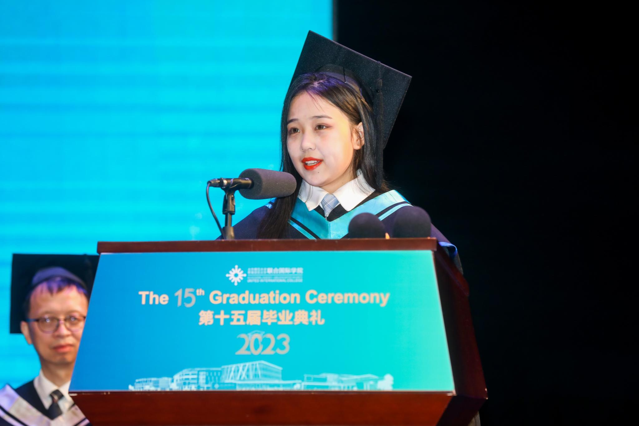 I am Jiang Qinghua. I attended UIC five years ago. I completed both undergraduate and postgraduate studies in the School of Culture and Creativity. Today, I have the great honour of representing the Graduate School on this most memorable occasion. I’m proud to say that I am a UIC product through and through!