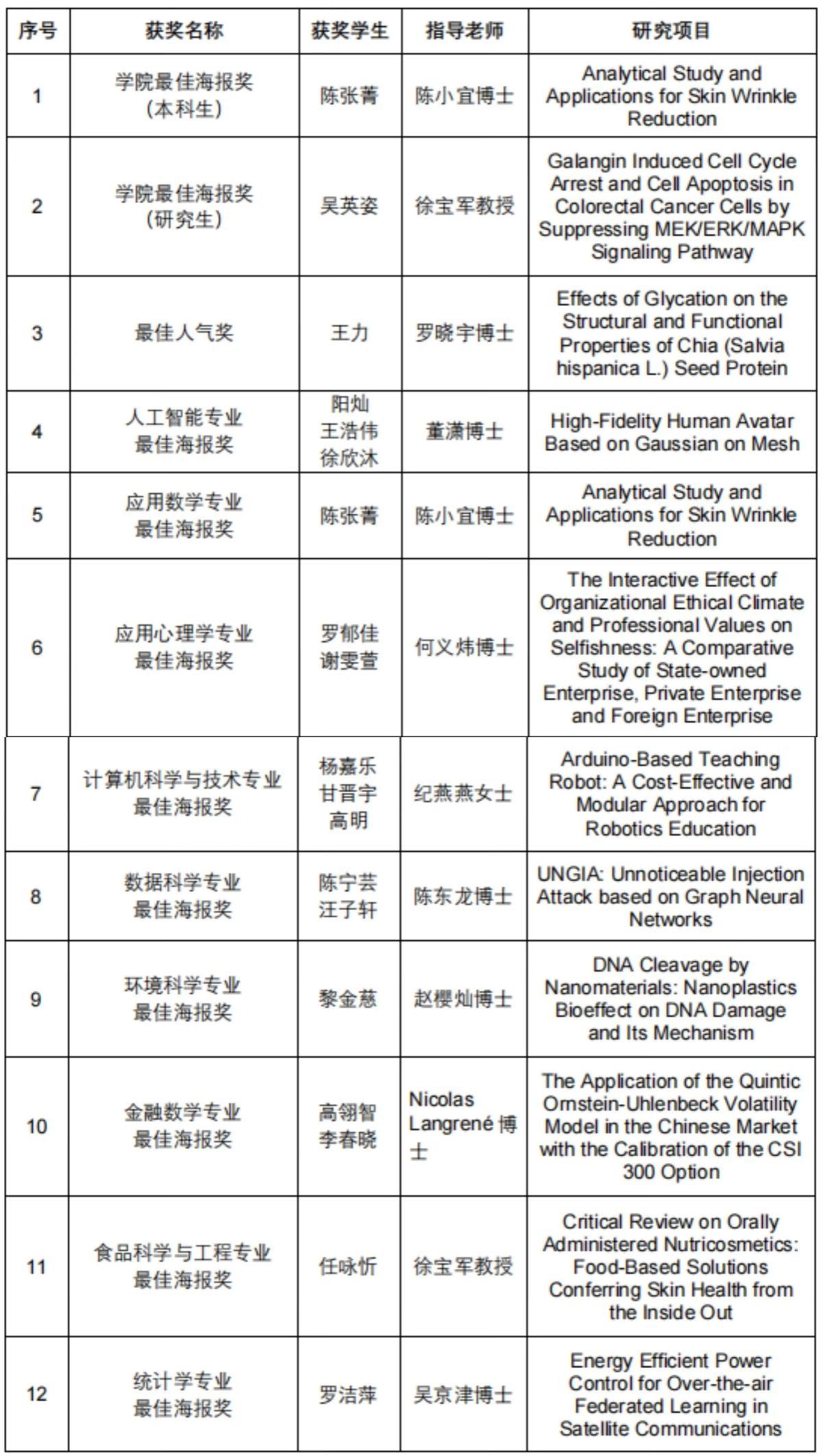 经过激烈角逐,本届海报展最终评选出12项奖项,包括:学院最佳海报奖(本科生)1项、学院最佳海报奖(研究生)1项、学院最佳人气奖1项,以及专业最佳海报奖9项。获奖名单如下: