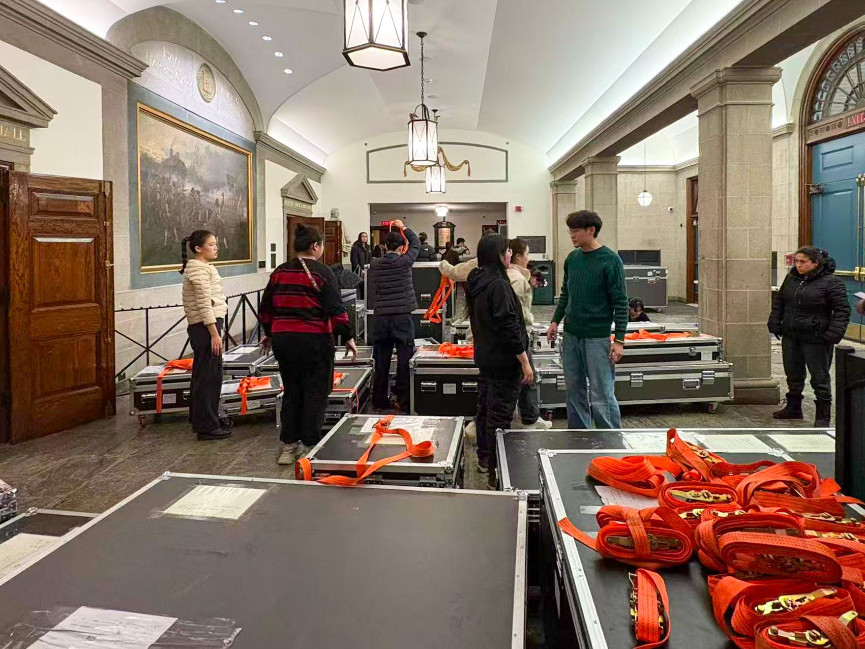 乐器的“远征”准备,更是一场与重量和细节的较量。31个航空箱,3.6吨重的乐器,每一件都要拆解、打包、做防撞处理,确保在长途运输中万无一失。编钟、建鼓等重器的拆解组装需要精准操作,同学们跟着老师反复练习,不辞辛苦。那些天,排练厅里除了乐声,就是打包带拉扯的声响,每个人都累得腰酸背痛,却没人偷懒。正是这份细致与付出,让这些承载着千年文明的乐器,有了跨越太平洋的底气。