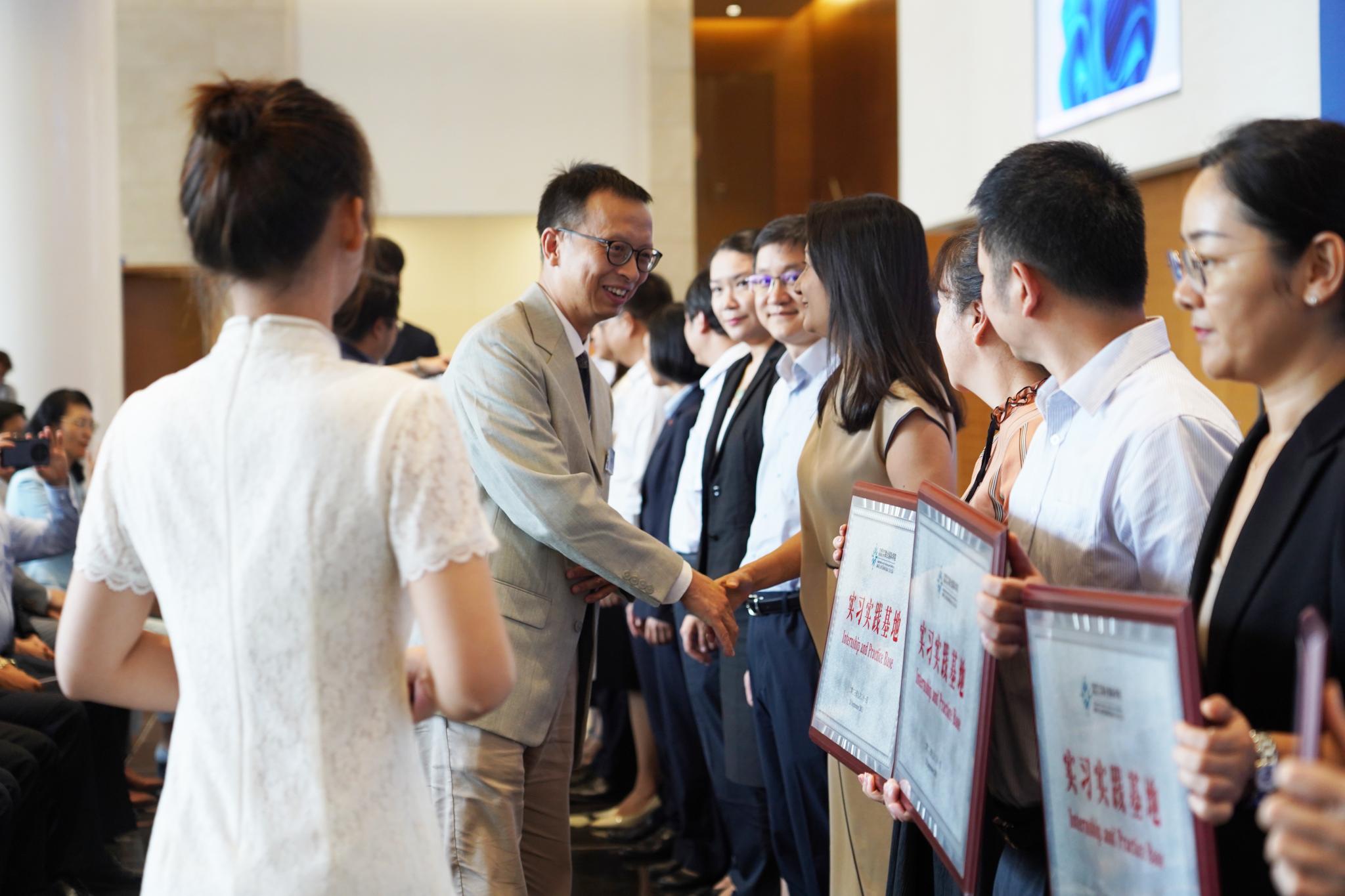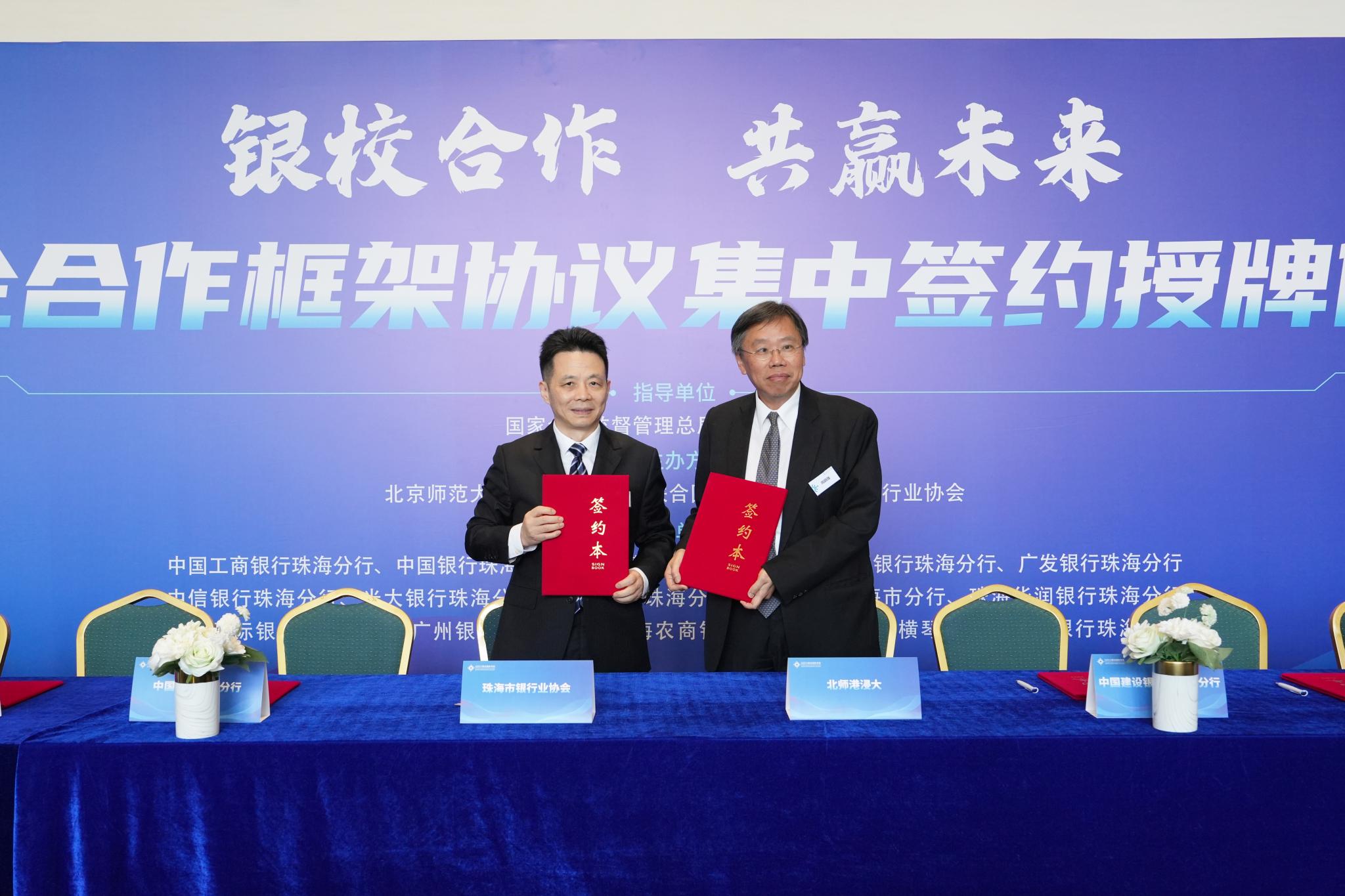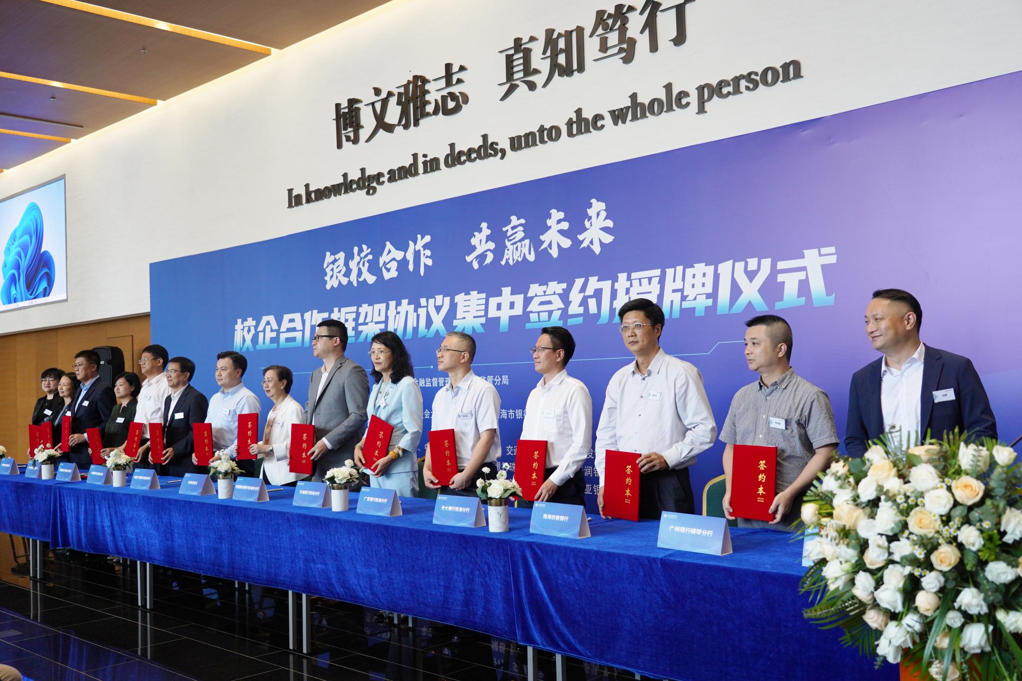 UIC常务副校长周荫强,协理副校长、通识教育学院署理院长左龙佩兰分别与珠海市银行协会和15家银行签署合作框架协议。UIC财务总监戴振伟、工商管理学院署理院长吴盖宇为15家银行授予UIC“实习基地”牌匾。