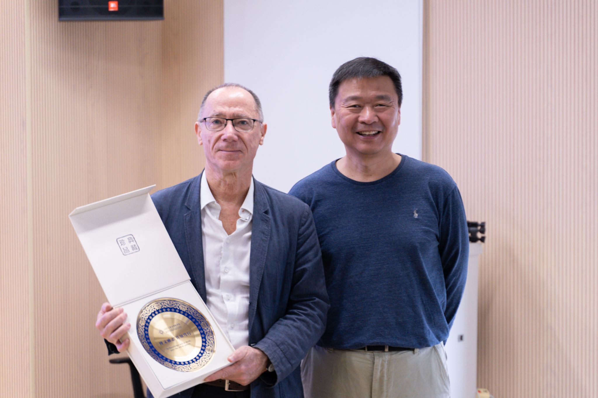 讲座主持人、北师港浸大讲座教授单肖文(右)向Luca Biferale教授赠送纪念品