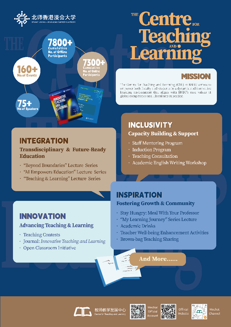 北师港浸大教师教学发展中心以促进卓越教与学为使命,于2021年1月成立,同年获批广东省本科高校教学质量与教学改革工程项目。自成立以来,中心累计举办160余场涵盖人工智能赋能教育、跨学科融合与教学技能提升等主题的专业发展活动,覆盖线上线下教师超过15000人次。通过教师岗前培训、教学公开示范课堂、导师“传帮带”及个性化教学咨询,中心为教师提供从理念到实践的系统化成长路径,促进跨学科融合与教育模式创新。同时,中心充分发挥内地与香港高校合作办学优势,搭建跨校区、跨文化的交流平台,推动优质教学资源与成功经验的双向流动,为教师提升国际化教学视野,也为学生创造丰富、多元的学习环境。
