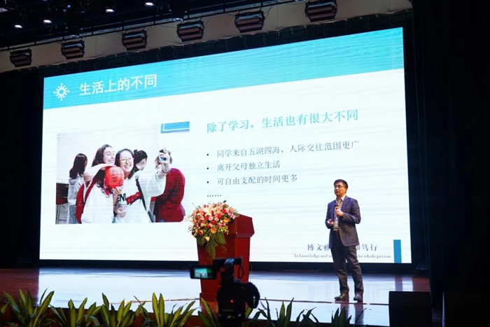 步入大学之门,学习上会有什么样的变化?汤校长从学习目标、内容和方式分析了高中与大学的不同。汤校长说,大学教育是传承知识和创新知识的教育,从学习内容到学习方式都是多元化的。他鼓励同学们尽快树立新的学习目标,将被动学习转变为主动学习,找到并深耕自己的领域,培养跨学科发展的综合能力,从传承知识走向创新知识。