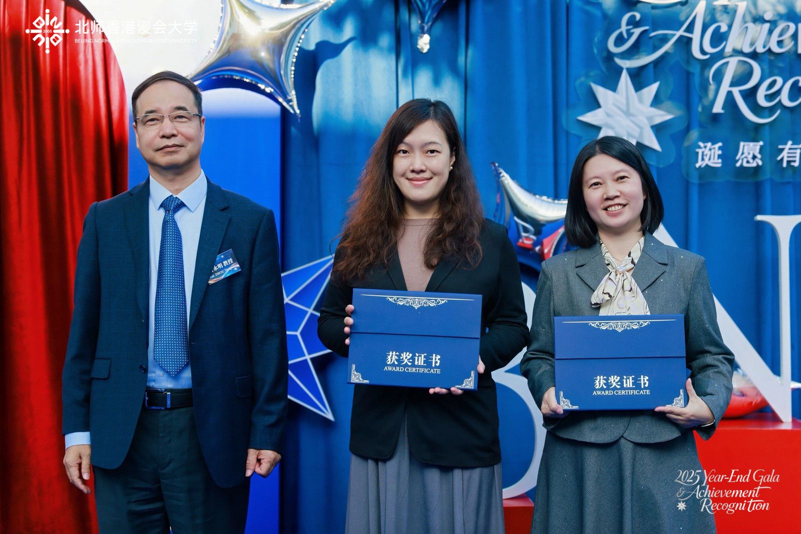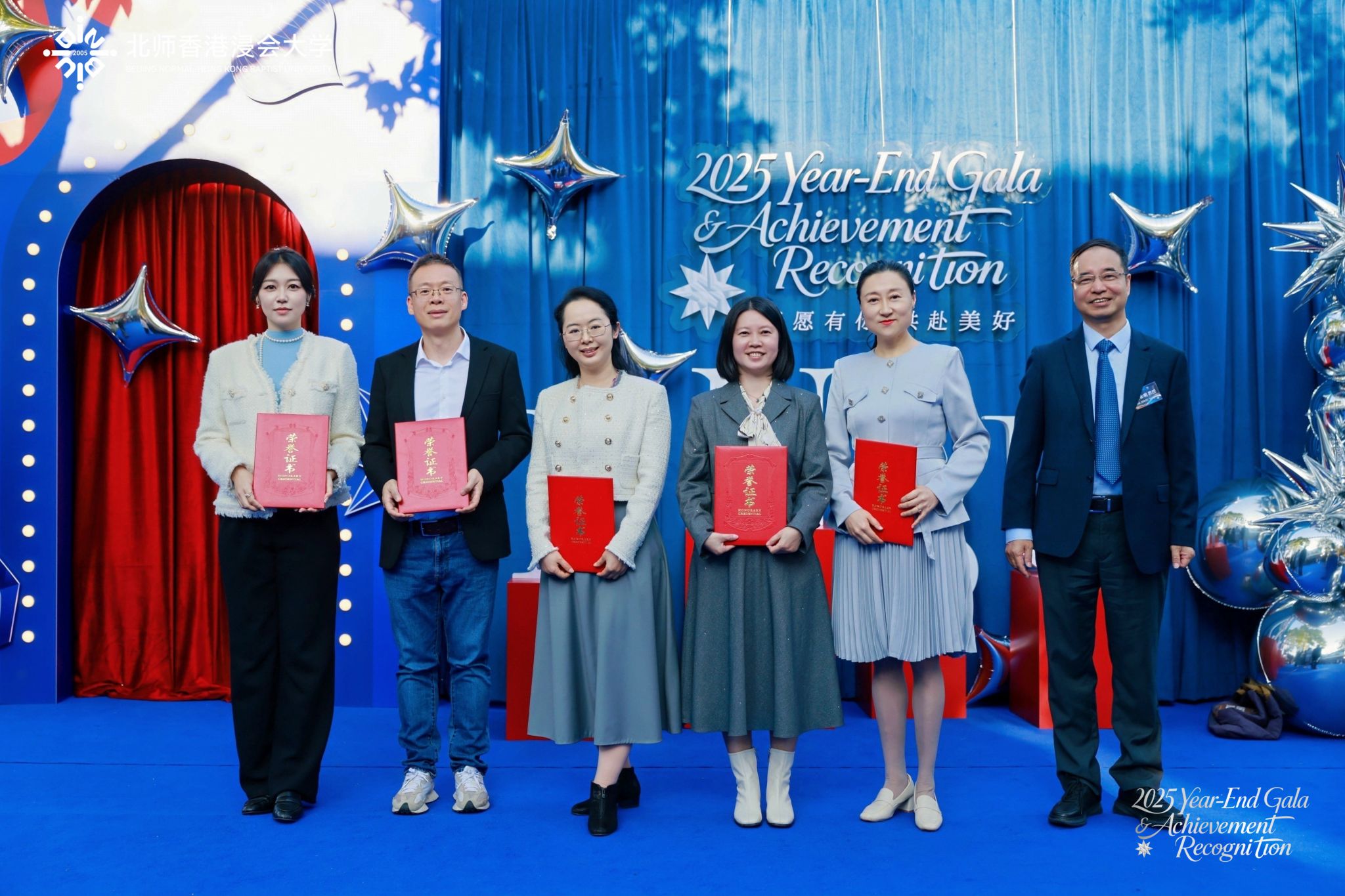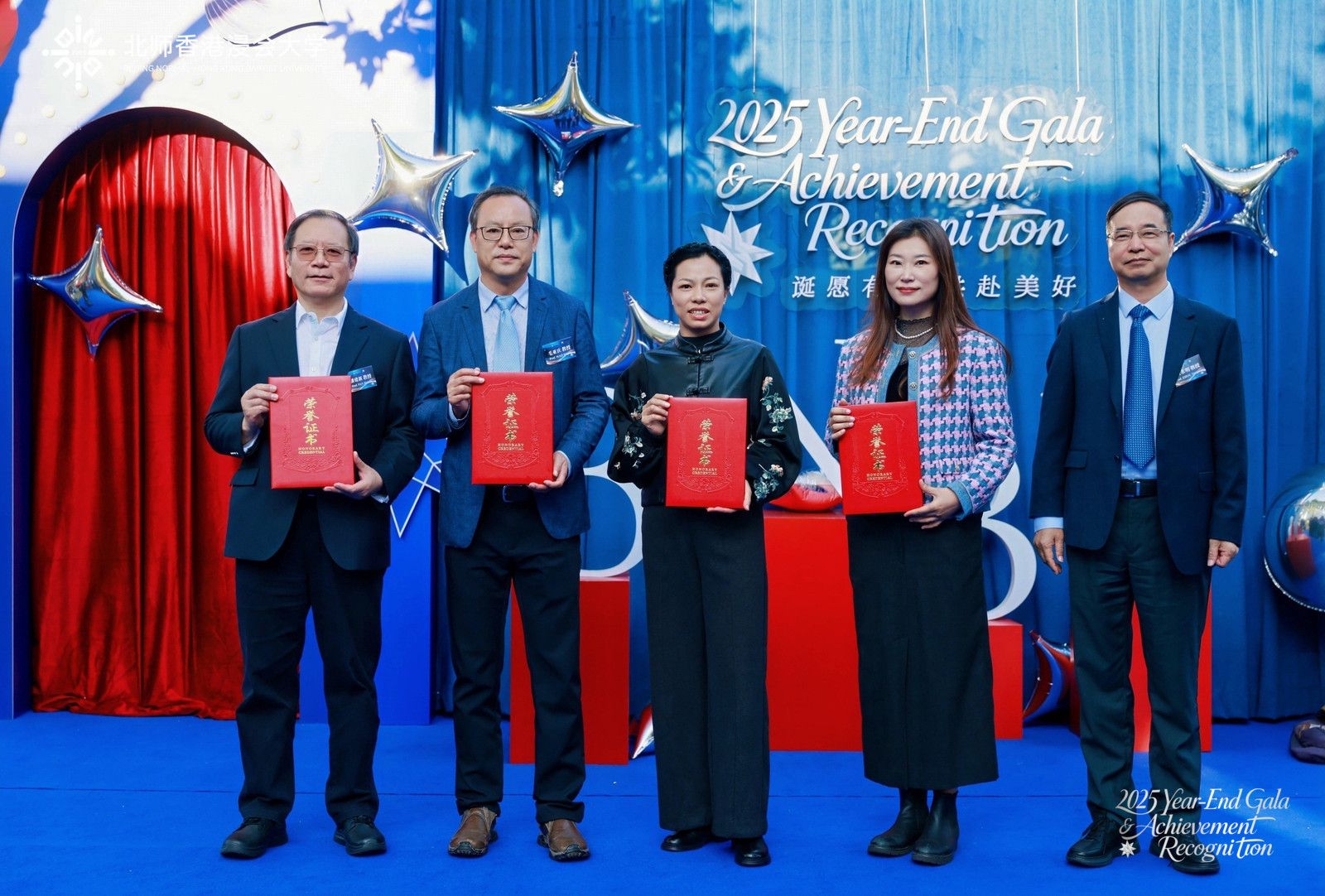苏伟峰教授团队、罗蓓博士团队、陈蓉蓉博士团队、李璐玚博士团队、汪洁博士荣获北师港浸大2025校级教学成果奖(图为获奖人及受托代表接受奖项)