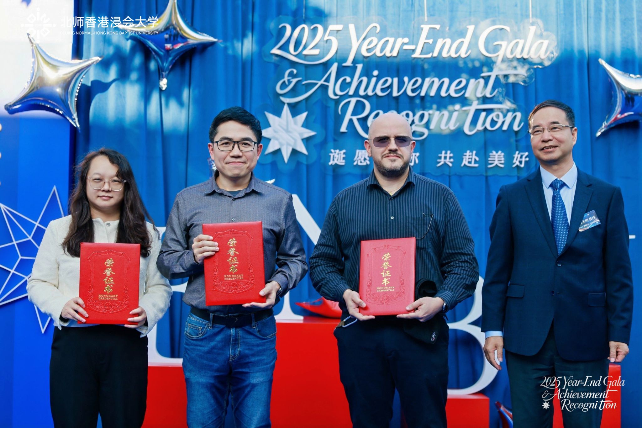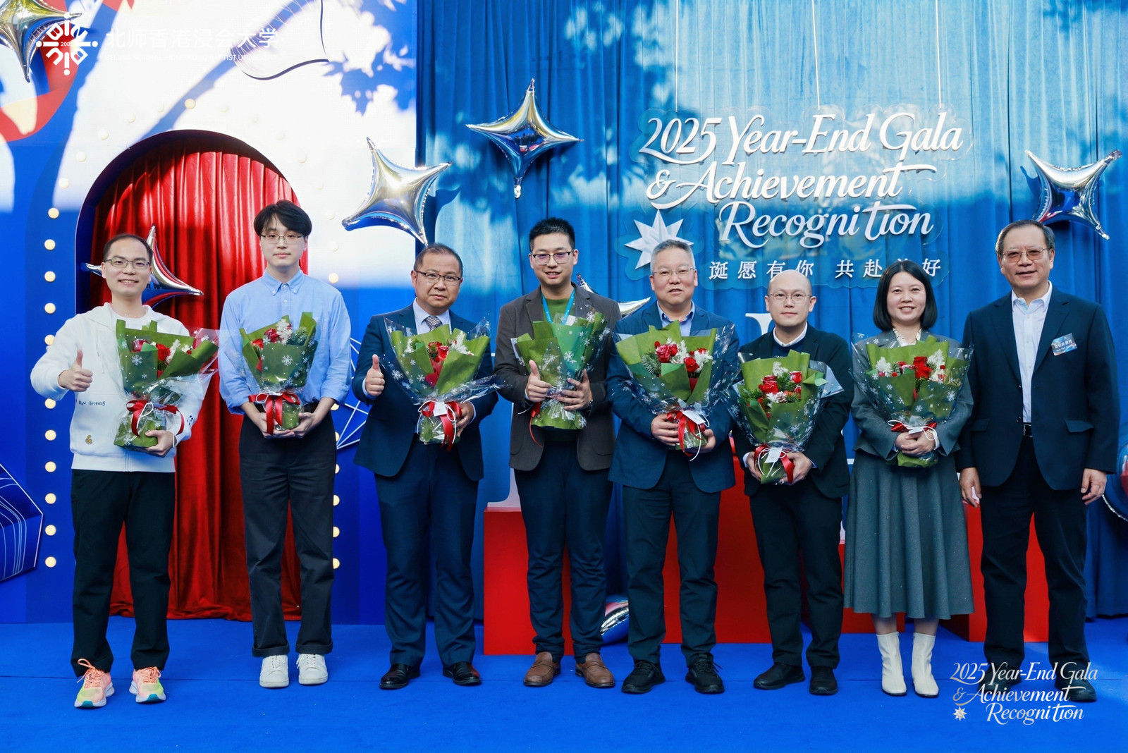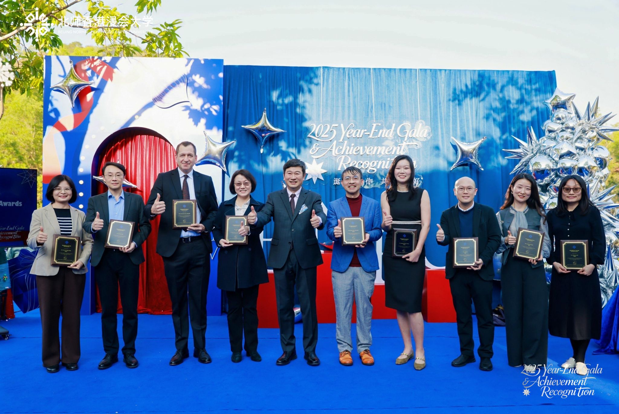 苏伟峰教授团队、罗蓓博士团队、陈蓉蓉博士团队、李璐玚博士团队、汪洁博士荣获北师港浸大2025校级教学成果奖(图为获奖人及受托代表接受奖项)