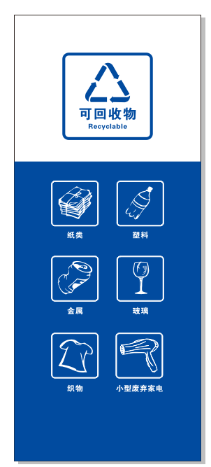 可回收物是指适宜回收和可资源化利用的生活垃圾,包括:纸制品、塑料制品、玻璃制品、纺织品、金属、小型废弃家电等。