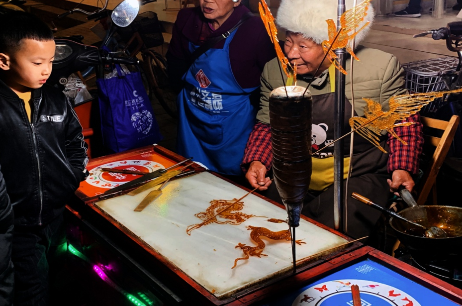 糖画是我童年记忆中最有年味的象征了。眼前是蹲在炉子上冒着热气的小锅、雕糖工具,一位头发花白的手艺人只需一会儿就画出了各式各样的图案。每逢春节,我都会去摊上买上一串,或只是陪着弟弟妹妹去凑凑热闹,手艺人不仅勾勒出了活灵活现的物,更勾勒出我心中年味的样子。