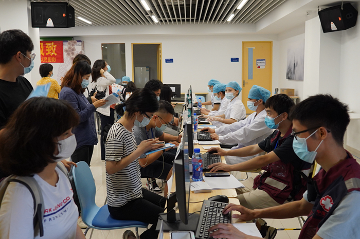 中心每处区域均配备工作人员负责引导接种者进行测温、登记、接种、观察、签字,确保疫苗接种工作高效、有序进行。
