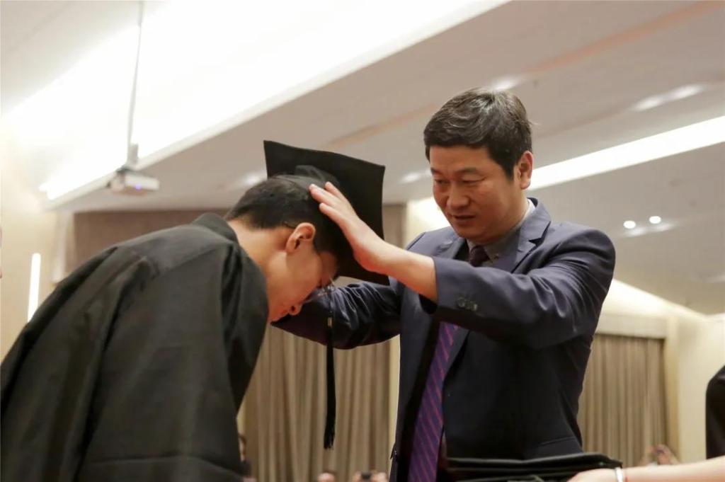 三拜三加,拜主宾。参礼学生着学士服,珠海慈善总会会长尤镇城(上图)和陈致教授(下图)为学生佩戴学士帽