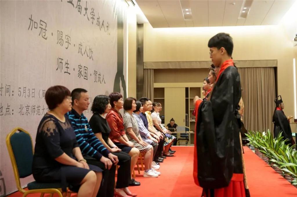 初拜初加,拜父母。参礼学生着汉服,家长分别为女生佩戴发簪,为男生加冠