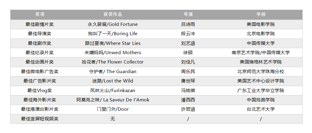 活动共评出了最佳剧作奖、最佳导演奖、最佳剧情片奖等十个奖项。其中美国电影学院的吕诗雨导演的《永久居留》获得最佳剧情片奖,北京电影学院的段云冲凭借影片《狗叫了一天》获得最佳导演奖。