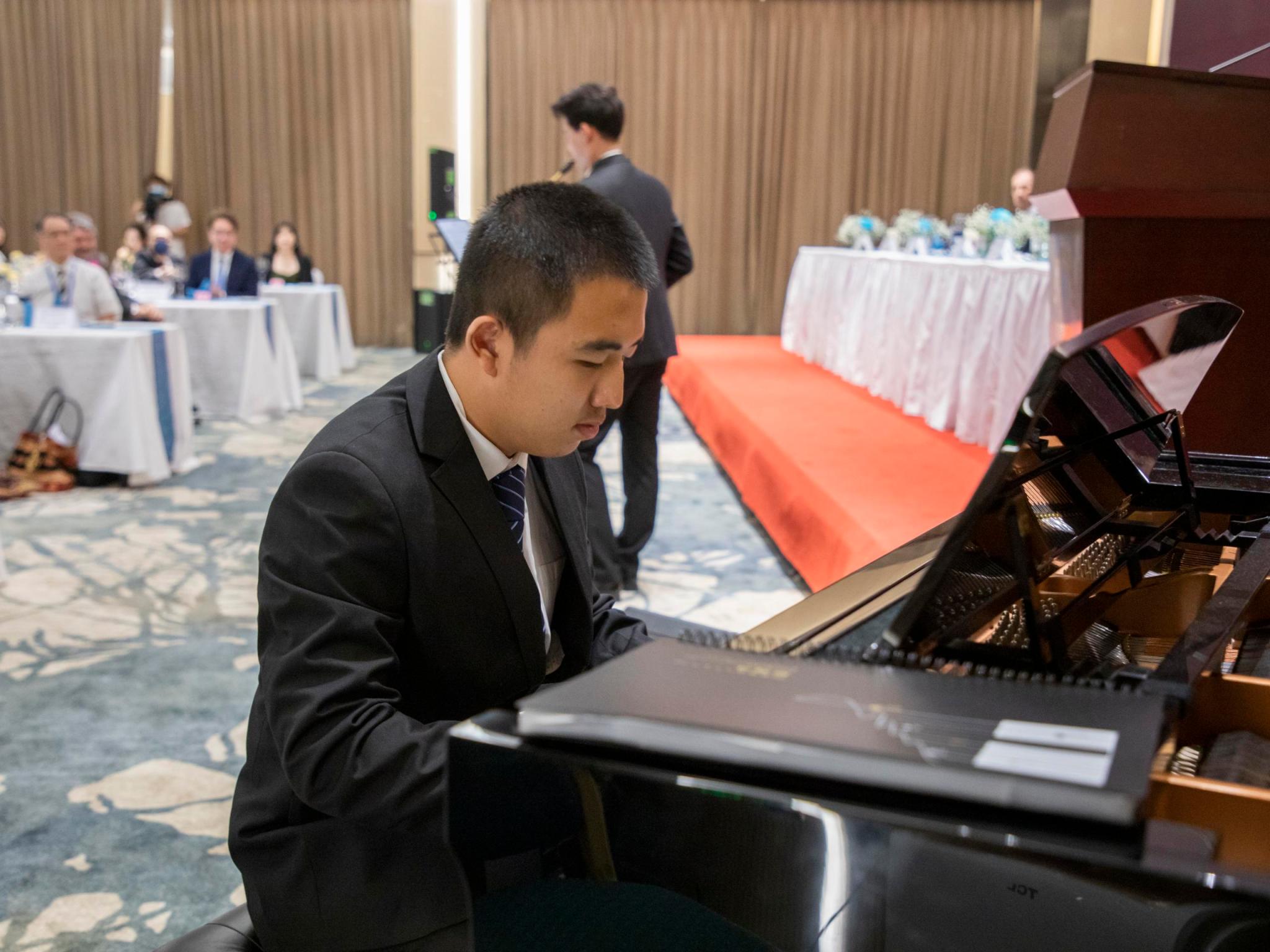 晚宴上,杜文雨萱(2019级影视专业)带来《丝路驼铃》的中阮演奏,隆文威(2021级新闻传播大类)与黄天俊(2021级外国语言文学类)带来《鸟》的第二乐章。