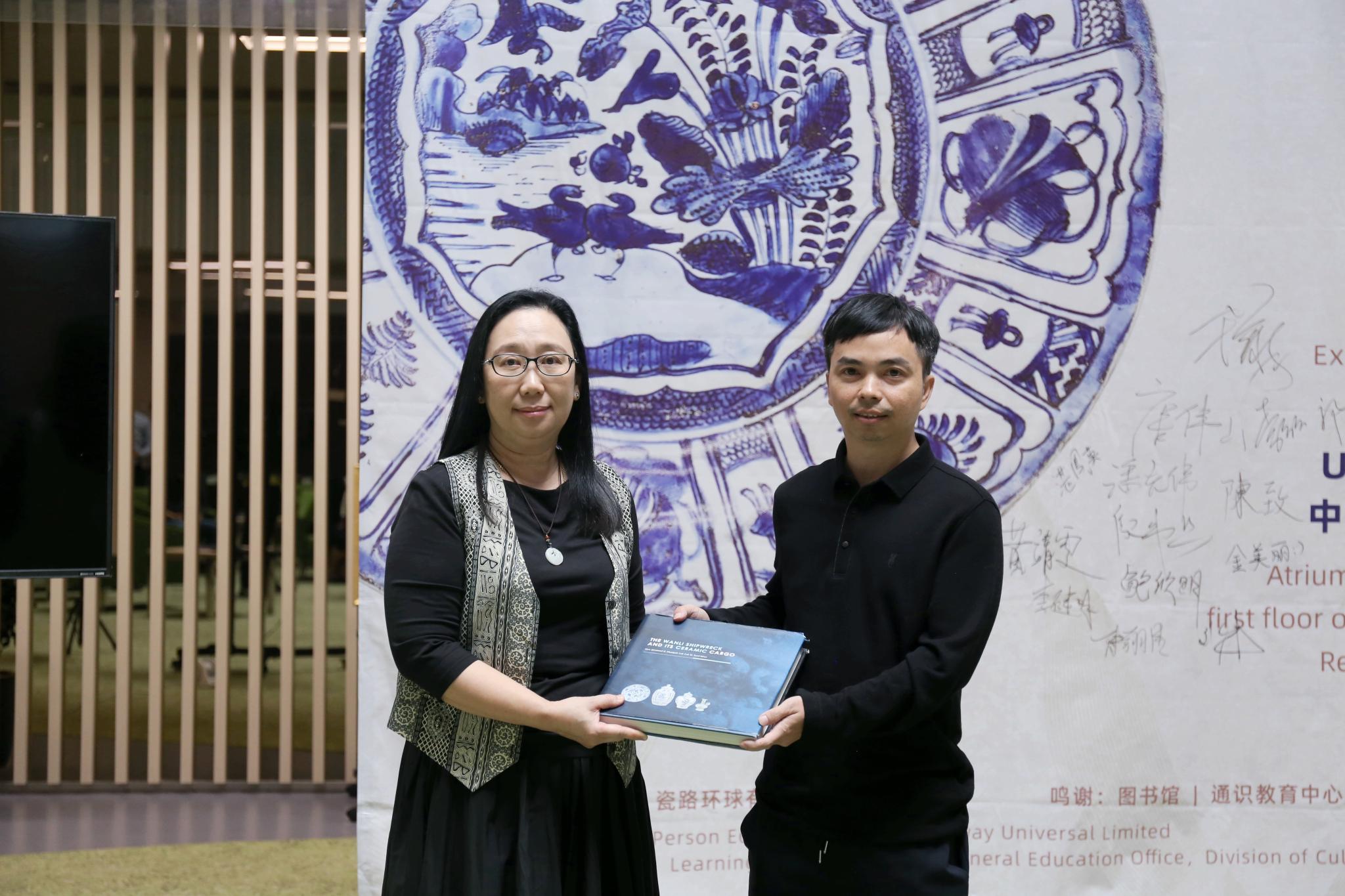 湛凤英女士(左)代表UIC接受唐伟山先生赠送的史坦先生亲笔签名《万历号沉船瓷器》专著