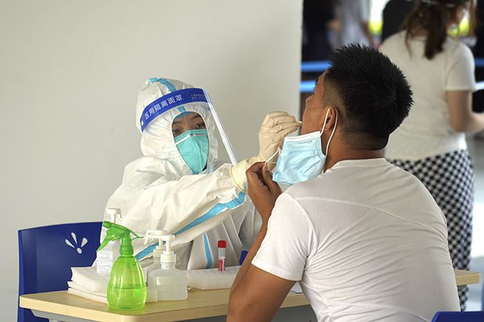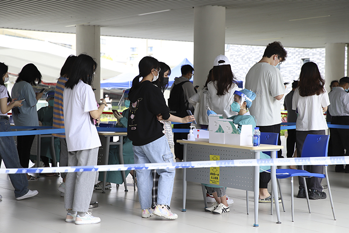 战疫进行时,师生积极响应,自觉排队,配合全员核酸检测,现场队伍有条不紊。