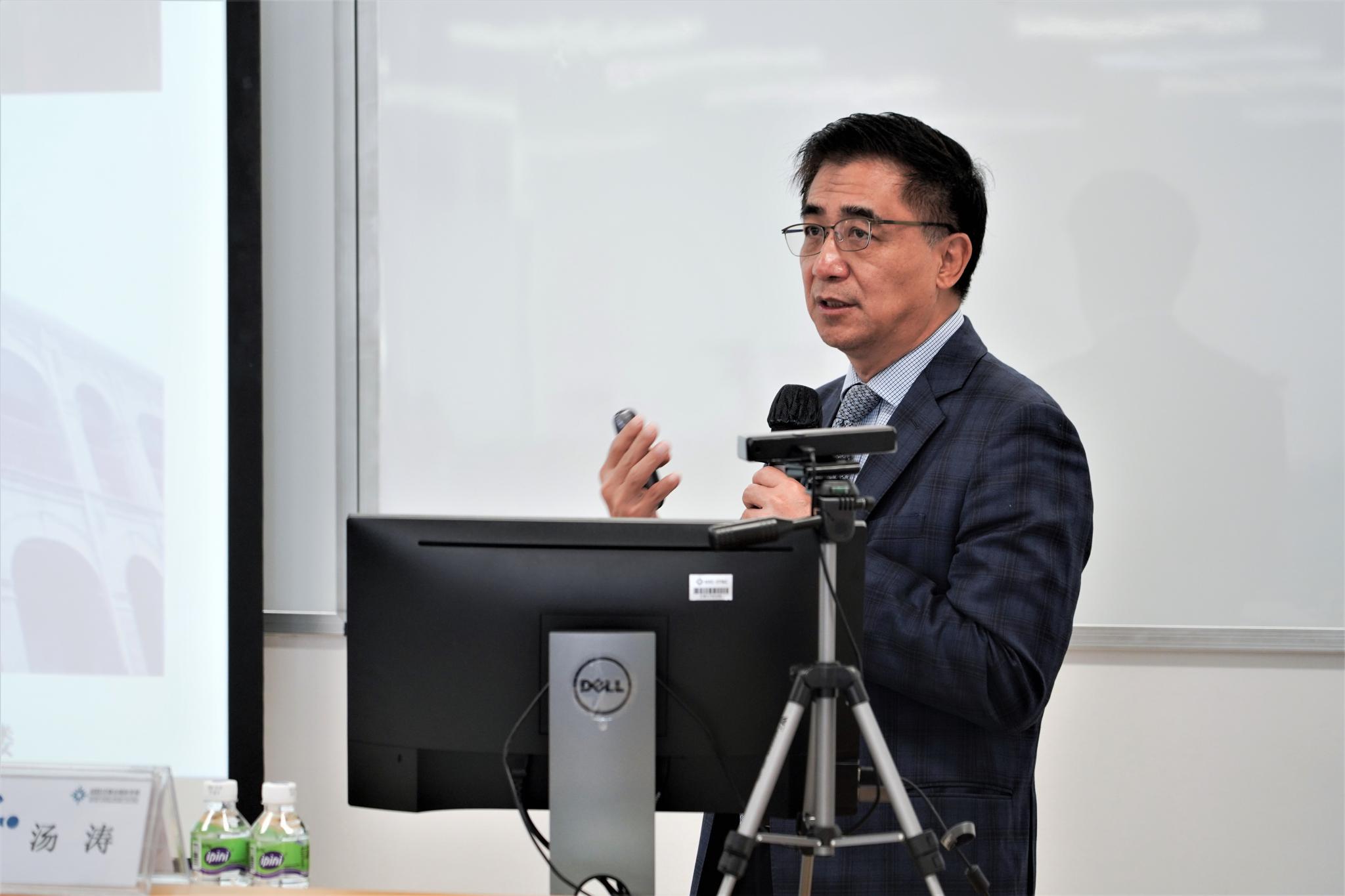 本次讲座由常务副校长陈致教授主持,他首先介绍了汤校长的学术背景。汤校长1984年毕业于北京大学数学系,1989年获得英国利兹大学博士学位,随后在香港浸会大学、南方科技大学等高校担任重要职位。2017年当选中国科学院院士,2019年出任UIC校长。在此期间,汤校长荣获多项国家级和国际级的学术荣誉和科技大奖,最近更是当选欧洲科学院院士。