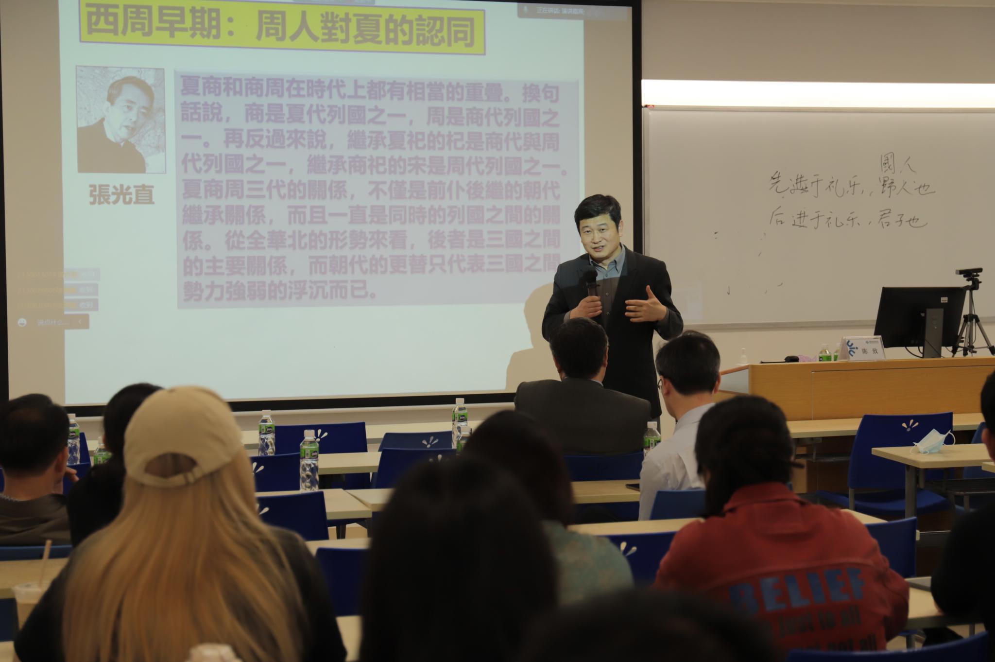 《史记·孔子世家》有言:“诗三百,孔子皆弦歌之。”说明自古就有诗乐一体之传统。然而,乐从何起?便要追溯雅乐的滥觞了。在了解雅乐的源头之前,陈教授为同学们梳理了夏商周三代的关系。傅斯年在《夷夏东西说》《周东封与殷遗民》等著作中认为,夏商周三代兼具时间和空间的交叉性。哈佛大学考古学家张光直教授在傅斯年的理论和其它考古学证据的影响下提出:“夏商周这三代的关系,不仅是前仆后继的朝代关系,而且一直是同时的列国之间的关系。”实际上早期文献中并没有清晰的夏商周的区分,西周时期的文献记载中,周人也常以夏自居,如《君爽》中周公言:“惟文王尚克修和我有夏。”周人为何自称为夏?对此学界有不同的说法:一说是由于婚姻关系,也有说周本为地名,古公亶父迁居于此,取地名为部族名,而夏是最初的部族名。在陈致教授看来,周人以夏自居的真正原因是为了“争正统”。《尚书·立政》言:“帝印罚之(殷),乃伻(抨)我有夏,式商受命,奄甸百姓。”也即是说,面对比自己强大的商,周人出于某种政治上的需要而认同夏。以夏自居,不仅使各方面处于劣势的周人寻找到了一种精神上乃至政治上可以与殷人相抗的依据,从夏人那里承袭的“夏乐”也具有音乐之上的某种民族文化象征意义。正因为如此,周人在灭商后,并没有全盘接受殷人的音乐文明,所以在周代的雅乐中便有文乐“大夏”和武乐“大武”之分。