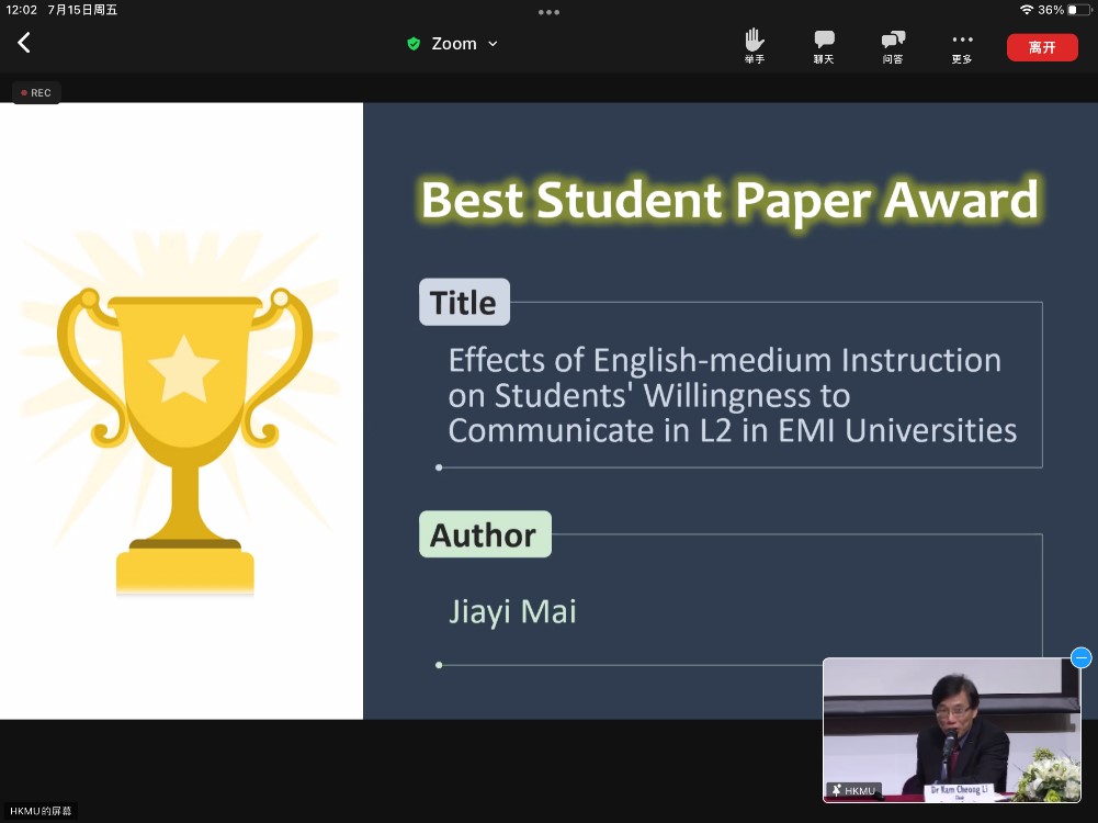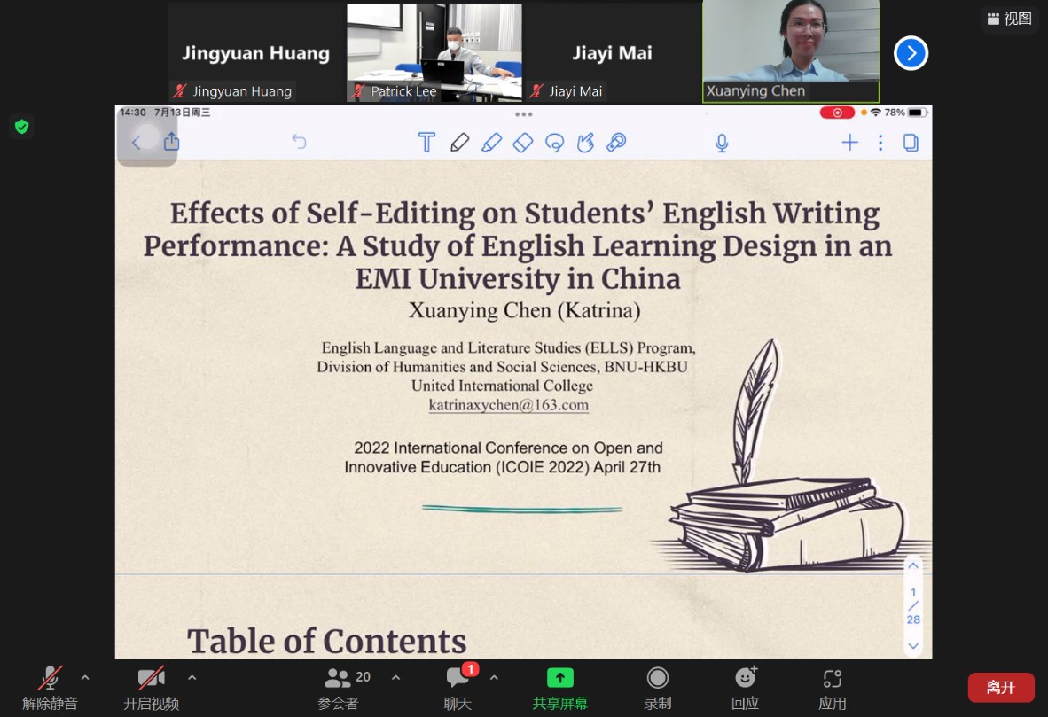 7月13日至15日,北师港浸大(UIC)2018级英语语言文学专业麦嘉仪、杨熠、黄靖媛、陈宣颖和郑雨宁五位同学在线参与在香港举行的2022开放与创新教育国际会议(ICOIE 2022)并发表论文。其中,麦嘉仪获得本届大会最佳学生论文奖。