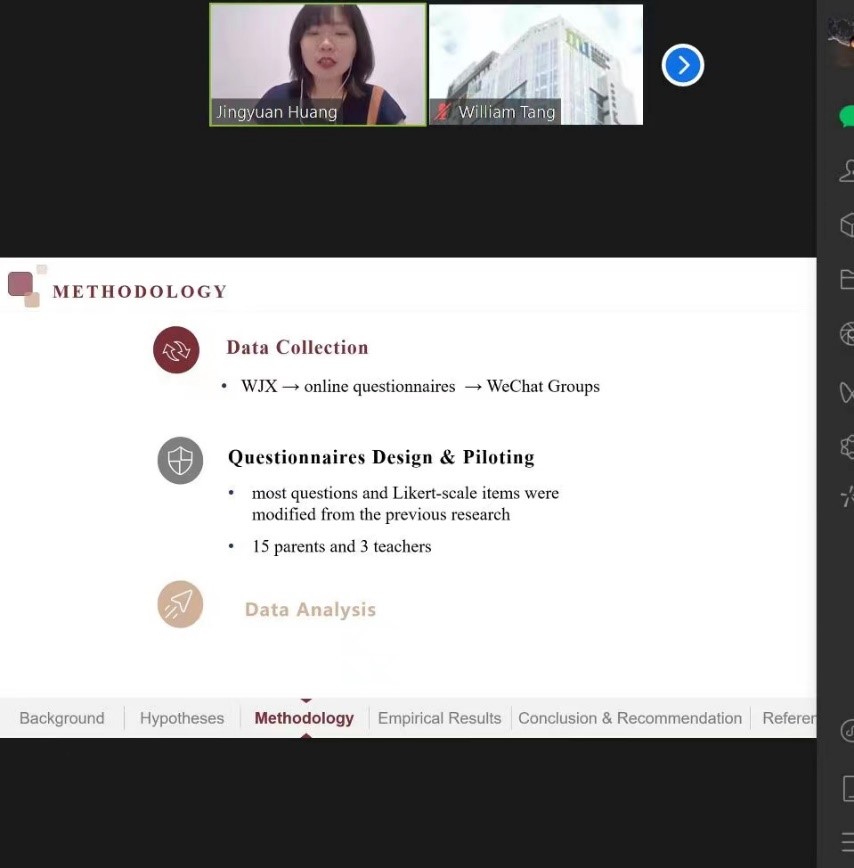 黄靖媛的研究致力于调查以中文为主要教学语言的老师和家长对于双语幼儿园的看法及其影响因素。她希望通过ICOIE这个平台,让更多人了解到由于社会经济因素导致的英语教育资源的分布不均以及其对于第二语言学习成就的影响,从而推动中国幼儿阶段双语教育的发展。黄靖媛感谢李宙映博士、甄美仪副教授、杨丽娟博士的指导以及人文与社会科学学部学生研究基金的支持。