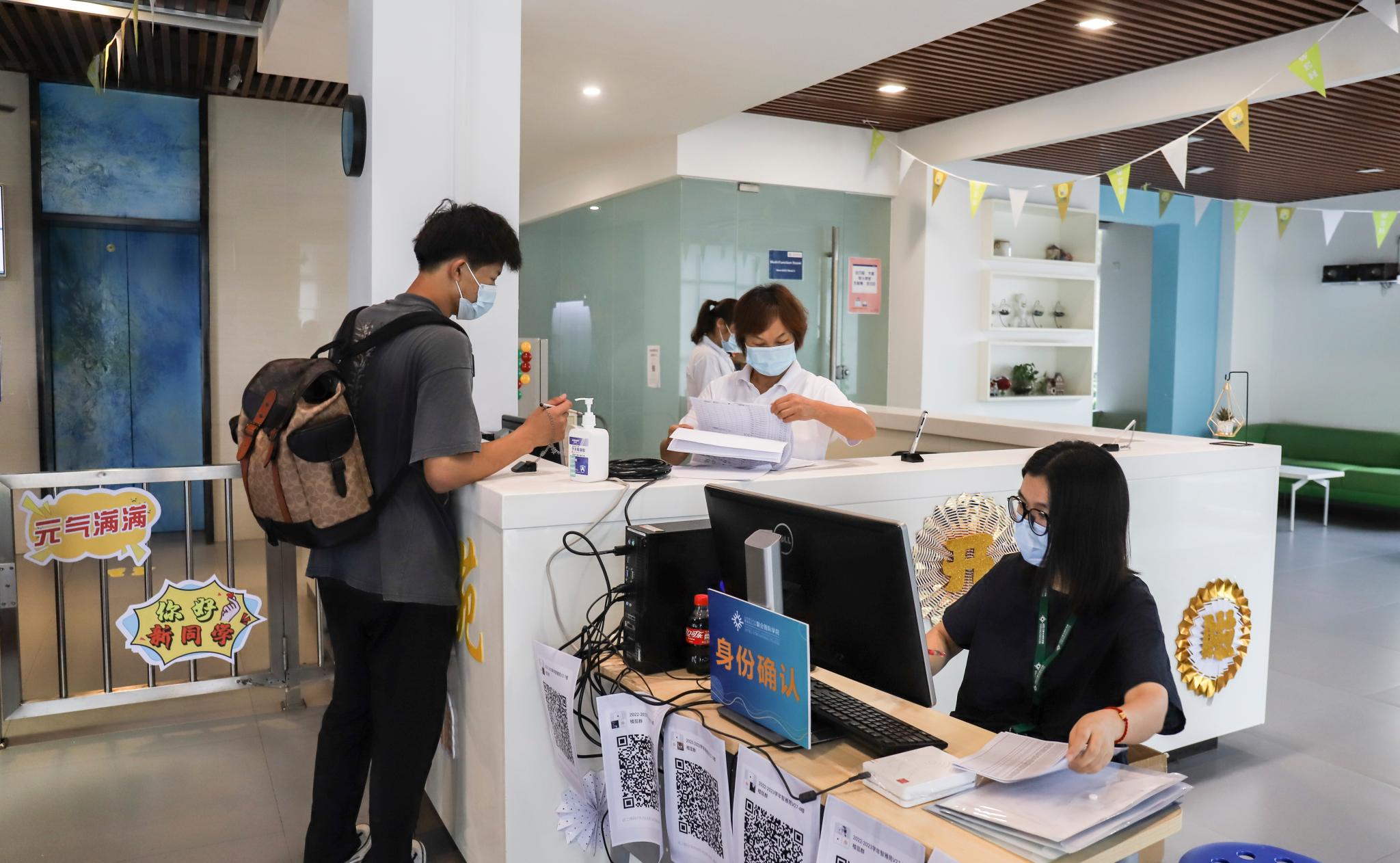 由老师和学生组成的志愿者团队早早等候在学校门口。在他们的指引下到校的新生有序入校。志愿者们穿梭于学校门口与学生宿舍之间,热情帮助萌新们搬运行李并完成入宿。
